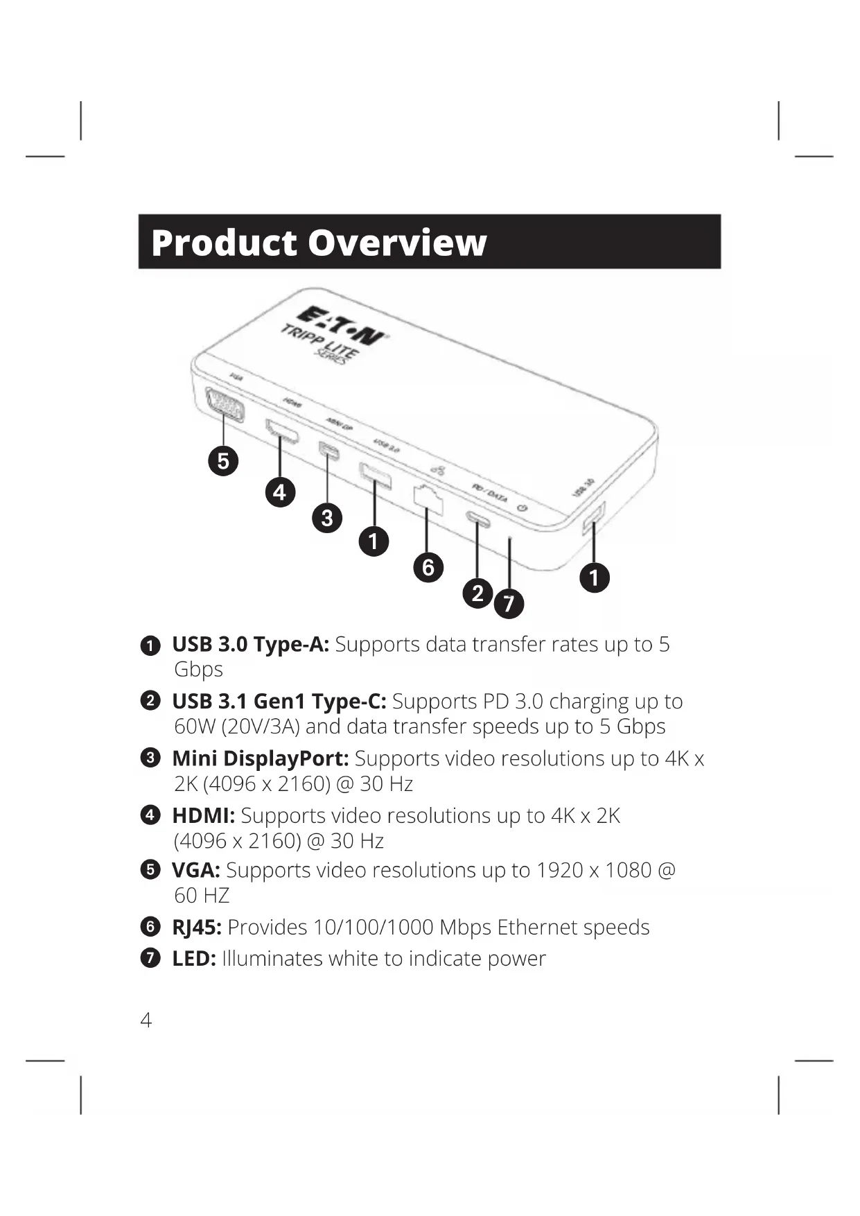 port or transfer data up to 5 Gbps.7 Specications Input Connector USB USB Type-C (x1) Output Connectors USB USB 3.0 Type-A (x2) USB-C Data/Charge (x1) USB-A Ethernet RJ45 Video HDMI Mini DisplayPort VGA Environmental Operating Temperature 32°F to 122°F (0°C to 50°C) Storage Temperature -4°F to 158°F (-20°C to 70°C) Relative Humidity 10% to 90% RH, Non-Condensing Physical Unit Dimensions 6.5 x 3 x 0.81 in. (165 x 75 x 20.5 mm) Unit Weight 0.33 lb. (0.15 kg)8 Specications Specications HDMI Specication 1.4 HDCP Specication 1.4 DisplayPort Specication 1.2 Max. Supported Video Resolutions HDMI (4096 x 2160 @ 30 Hz) Mini DisplayPort (4096 x 2160 @ 30 Hz) VGA (1920 x 1200 @ 60 Hz) Network Speed 10/100/1000 Mbps or 1 Gbps Supported Color Depth (HDMI) 36 bit (12 bits per channel) Chroma Subsampling (HDMI) YCbCr: 4:4:4, 4:2:2, 4:2:0 PD Charging Specication PD 3.0 (60W)9 Troubleshooting Why am I not able to display resolutions of 4096 x 2160 @ 30 Hz? A. Click [Display Setting] > [Advanced Display Settings], then choose the desired resolution manually. B. Ensure the device, display and cable all support 4096 x 2160 @ 30 Hz HD. Why does my PD charging time vary? The upstream device (laptop) will auto-adjust the power input based on the battery level at that current time. Why won’t my HDMI, Mini DisplayPort and VGA displays show dierent screens? Most MacBook laptops do not support MST, allowing you to extend only one screen and mirror the other.10 3-Year Limited Warranty We warrant our products to be free from defects in materials and workmanship for a period of three (3) years from the date of initial purchase. Our obligation under this warranty is limited to repairing or replacing (at its sole option) any such defective products. Visit Tripplite. Eaton.com/support/product-returns before sending any equipment back for repair. This warranty does not apply to equipment which has been damaged by accident, negligence or misapplication or has been altered or modied in any way. EXCEPT AS PROVIDED HEREIN, WE MAKE NO WARRANTIES, EXPRESS OR IMPLIED, INCLUDING WARRANTIES OF MERCHANTABILITY AND FITNESS FOR A PARTICULAR PURPOSE. Some states do not permit limitation or exclusion of implied warranties; therefore, the aforesaid limitation(s) or exclusion(s) may not apply to the purchaser. EXCEPT AS PROVIDED ABOVE, IN NO EVENT WILL WE BE LIABLE FOR DIRECT, INDIRECT, SPECIAL, INCIDENTAL OR CONSEQUENTIAL DAMAGES ARISING OUT OF THE USE OF THIS PRODUCT, EVEN IF ADVISED OF THE POSSIBILITY OF SUCH DAMAGE. Specically, we are not liable for any costs, such as lost prots or revenue, loss of equipment, loss of use of equipment, loss of software, loss of data, costs of substitutes, claims by third parties, or otherwise. Warranty11 FCC Notice, Class B This device complies with part 15 of the FCC Rules. Operation is subject to the following two conditions: (1) This device may not cause harmful interference, and (2) this device must accept any interference received, including interference that may cause undesired operation. Note: This equipment has been tested and found to comply with the limits for a Class B digital device, pursuant to part 15 of the FCC Rules. These limits are designed to provide reasonable protection against harmful interference in a residential installation. This equipment generates, uses and can radiate radio frequency energy and, if not installed and used in accordance with the instructions, may cause harmful interference to radio communications. However, there is no guarantee that interference will not occur in a particular installation. If this equipment does cause harmful interference to radio or television reception, which can be determined by turning the equipment o and on, the user is encouraged to try to correct the interference by one or more of the following measures: