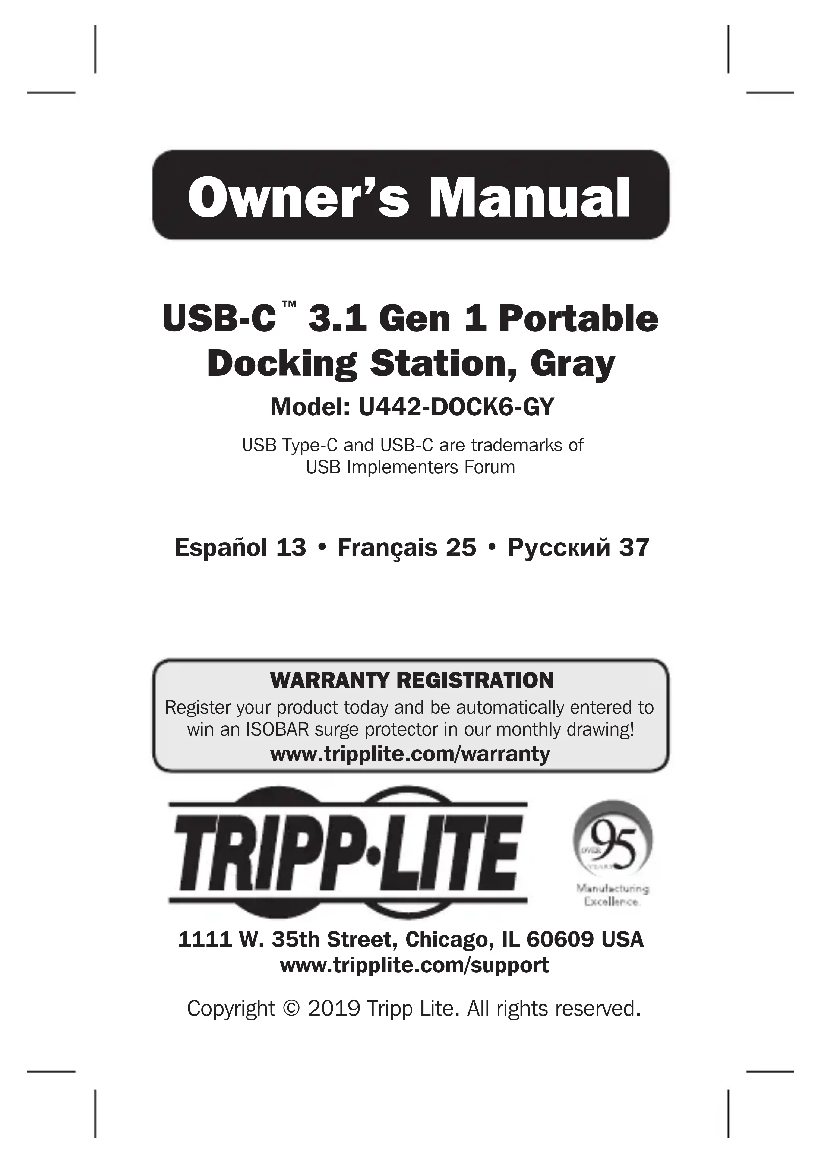 Docking Station, Gray Model: U442-DOCK6-GY USB Type-C and USB-C are trademarks of USB Implementers Forum 1111 W. 35th Street, Chicago, IL 60609 USA www.tripplite.com/support Copyright © 2019 Tripp Lite. All rights reserved. WARRANTY REGISTRATION Register your product today and be automatically entered to win an ISOBAR surge protector in our monthly drawing! www.tripplite.com/warranty Español 13 • Français 25 • Русский 372 Product Features