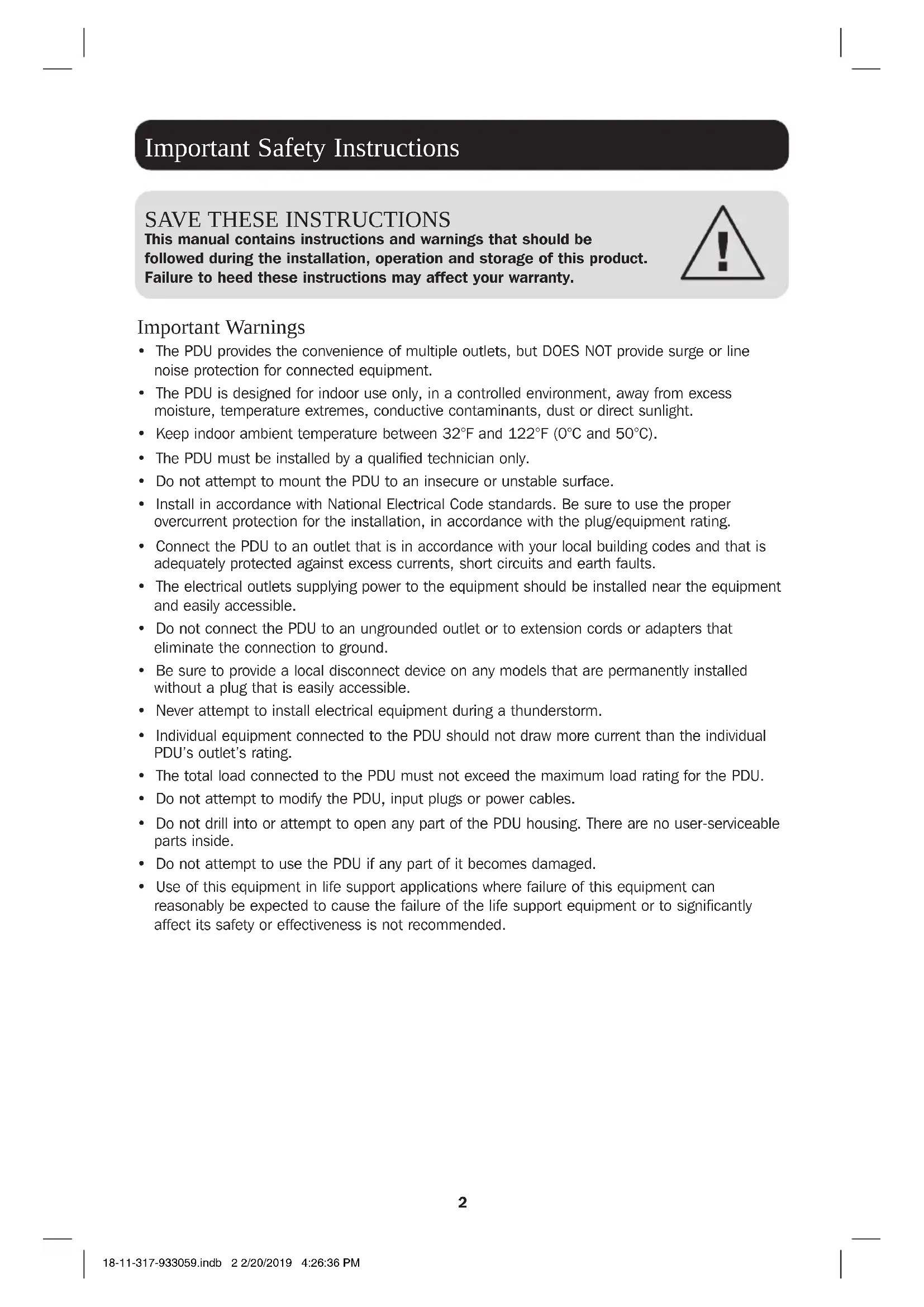 C20 Plug-Lock Insert Sleeve (Optional): Use the included plastic sleeves to secure C19 power cords to C20 inlets. Fit the sleeve over the end of the cord, making sure the pull-tabs remain outside the cord and the fit is secure. To unplug equipment properly, grip both the cord and the insert’s tabs at the same time and pull. 18-11-317-933059.indb 7 2/20/2019 4:26:39 PM8 Warranty & Warranty Registration