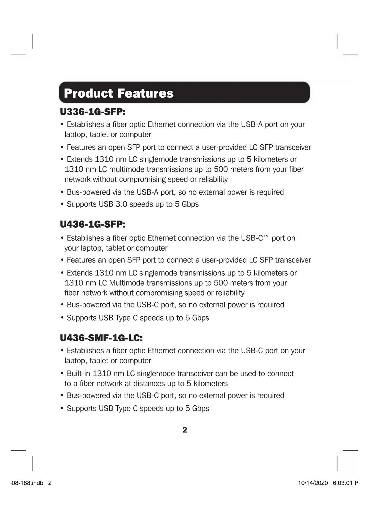 The LED will blink when data is being transferred. Package Includes System Requirements Installation 20-08-188.indb 320-08-188.indb 3 10/14/2020 6:03:01 PM10/14/2020 6:03:01 PM4 1111 W. 35th Street, Chicago, IL 60609 USA • tripplite.com/support 20-08-188 93-3D07_RevA Specifications U336-1G-SFP U436-1G-SFP U436-SMF-1G-LC Input Connector USB-A (Male) USB-C (Male) USB-C (Male) Output Connector Open SFP Transceiver Port (Female) Open SFP Transceiver Port (Female)