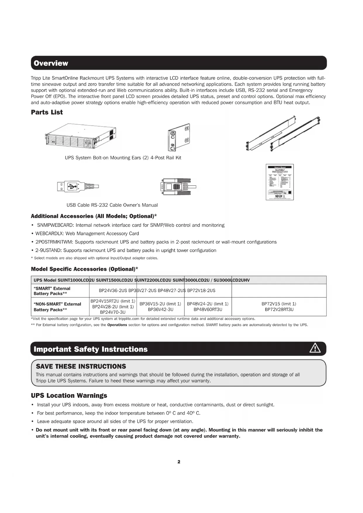 - Do not mount unit with its front or rear panel facing down (at any angle). Mounting in this manner will seriously inhibit the unit’s internal cooling, eventually causing product damage not covered under warranty. Tripp Lite SmartOnline Rackmount UPS Systems with interactive LCD interface feature online, double-conversion UPS protection with full- time sinewave output and zero transfer time suitable for all advanced networking applications. Each system provides long running battery support with optional extended-run and Web communications ability. Built-in interfaces include USB, RS-232 serial and Emergency Power Off (EPO). The interactive front panel LCD screen provides detailed UPS status, preset and control options. Optional max efficiency and auto-adaptive power strategy options enable high-efficiency operation with reduced power consumption and BTU heat output. Parts List UPS System Bolt-on Mounting Ears (2) 4-Post Rail Kit USB Cable RS-232 Cable Owner’s Manual Additional Accessories (All Models; Optional)*