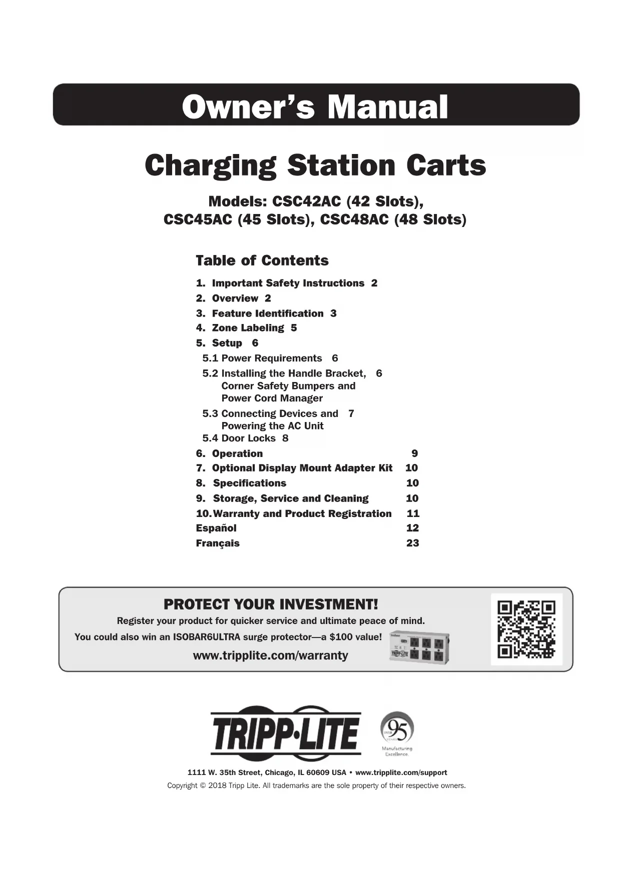 Español 12 Français 23 Charging Station Carts Models: CSC42AC (42 Slots), CSC45AC (45 Slots), CSC48AC (48 Slots) Owner’s Manual 1111 W. 35th Street, Chicago, IL 60609 USA • www.tripplite.com/supportCopyright © 2018 Tripp Lite. All trademarks are the sole property of their respective owners. PROTECT YOUR INVESTMENT! Register your product for quicker service and ultimate peace of mind. You could also win an ISOBAR6ULTRA surge protector—a $100 value! www.tripplite.com/warranty2