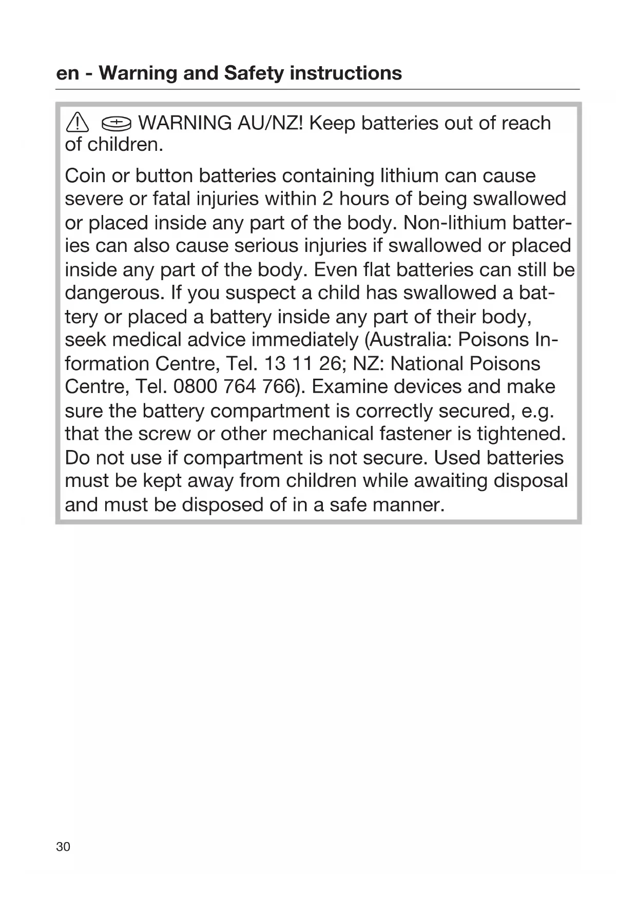 children. Coin or button batteries containing lithium can cause severe or fatal injuries within 2 hours of being swallowed or placed inside any part of the body. Non-lithium batter- ies can also cause serious injuries if swallowed or placed inside any part of the body. Even flat batteries can still be dangerous. If you suspect a child has swallowed a bat- tery or placed a battery inside any part of their body, seek medical advice immediately (Australia: Poisons In- formation Centre, Tel. 13 11 26; NZ: National Poisons Centre, Tel. 0800 764 766). Examine devices and make sure the battery compartment is correctly secured, e.g. that the screw or other mechanical fastener is tightened. Do not use if compartment is not secure. Used batteries must be kept away from children while awaiting disposal and must be disposed of in a safe manner.en - Warning and Safety instructions