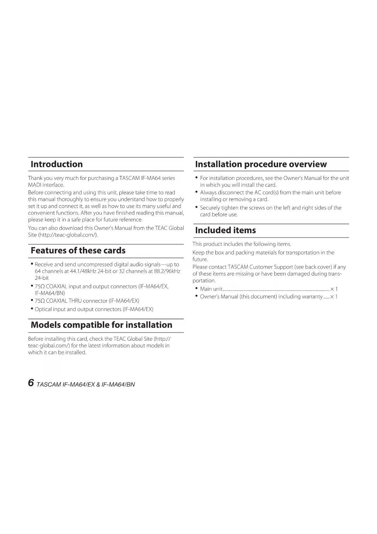 Owner’s Manual (this document) including warranty ...... × 1TASCAM IF-MA64/EX & IF-MA64/BN