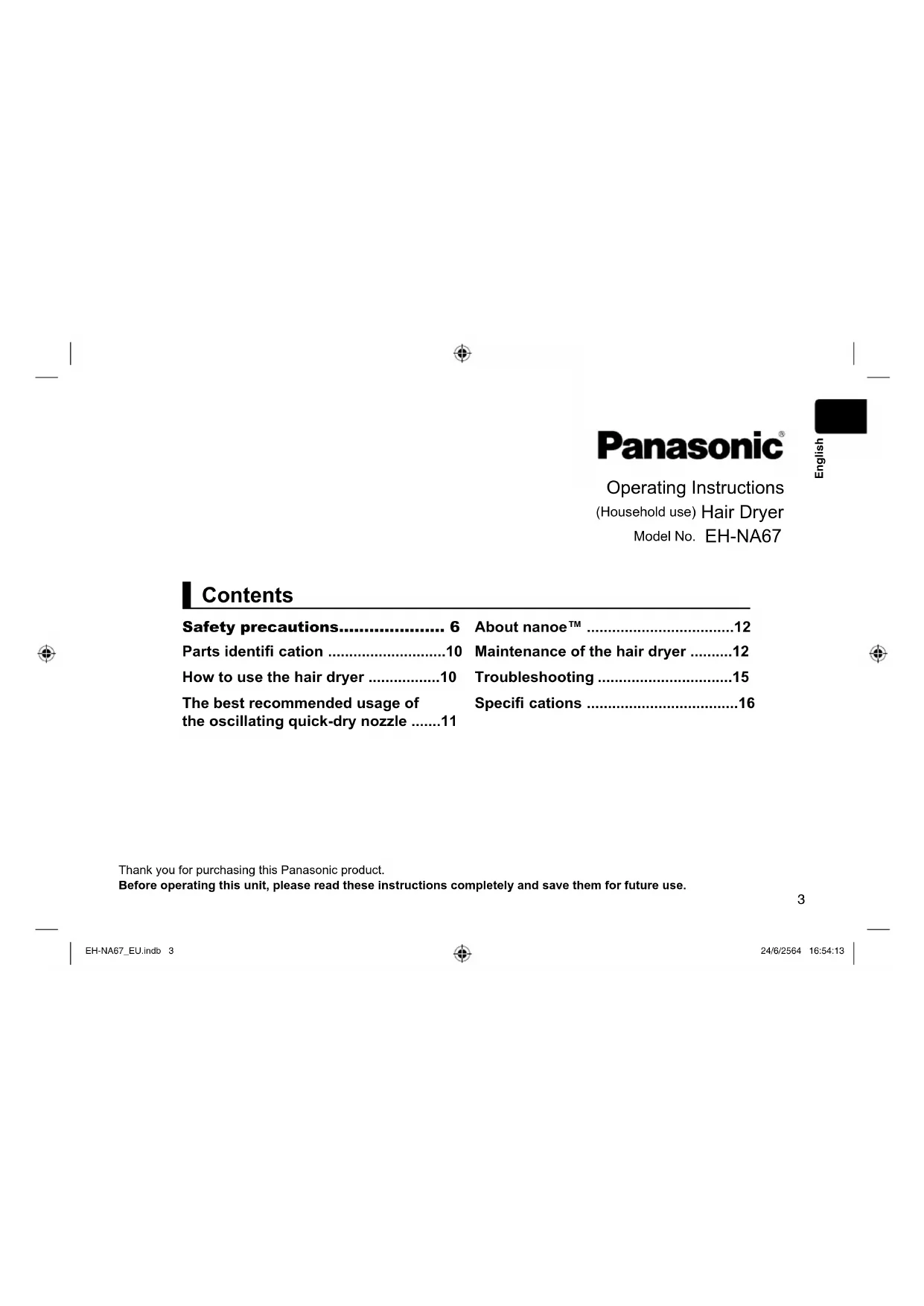 Download the instructions for your Hair Dryers in PDF format for free! Find your manual EHNA67 - PANASONIC and take your electronic device back in hand. On this page are published all the documents necessary for the use of your device. EHNA67 by PANASONIC.