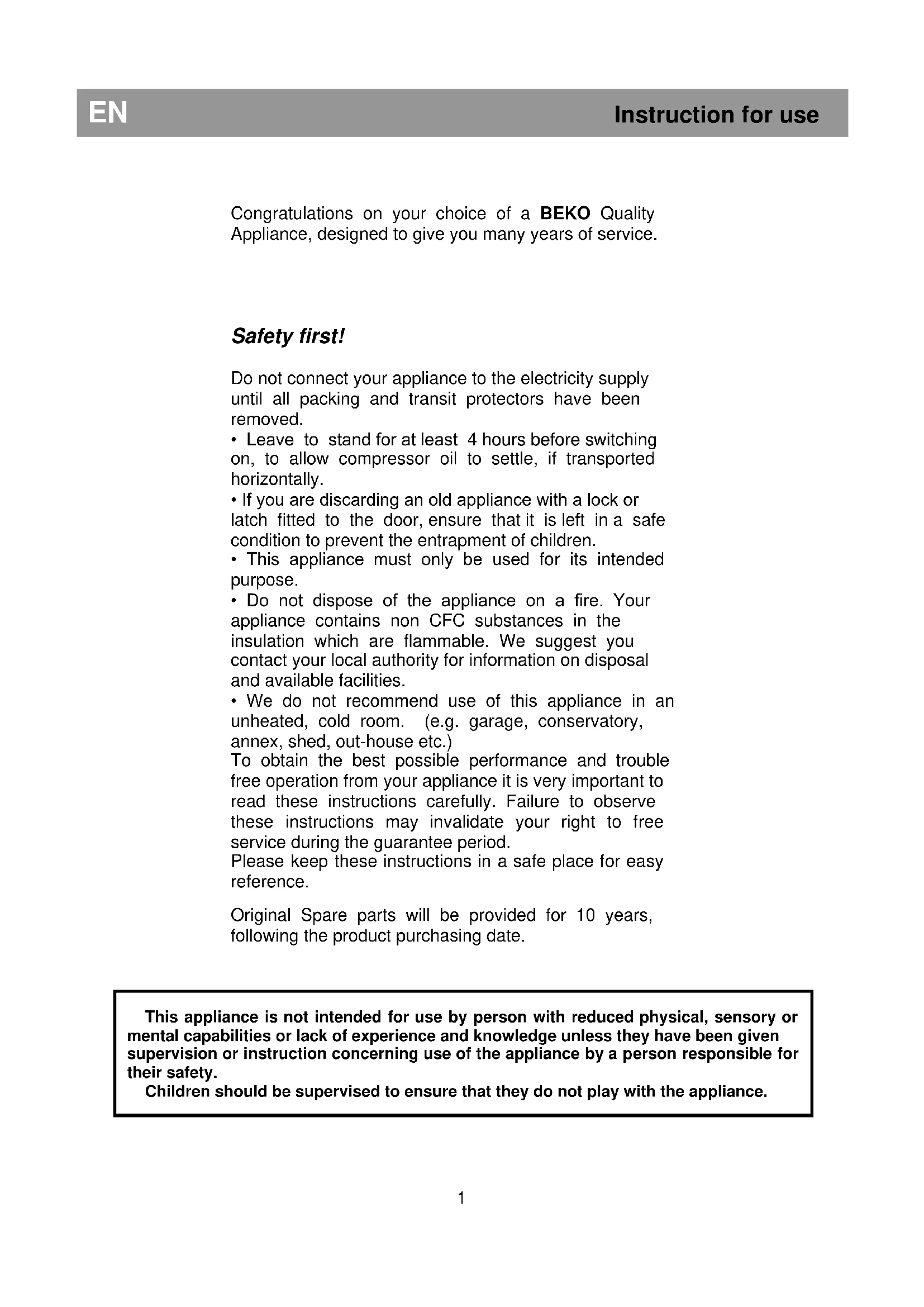 - We do not recommend use of this appliance in an unheated, cold room. (e.g. garage, conservatory, annex, shed, out-house etc.) To obtain the best possible performance and trouble free operation from your appliance it is very important to read these instructions carefully. Failure to observe these instructions may invalidate your right to free service during the guarantee period. Please keep these instructions in a safe place for easy reference. Original Spare parts will be provided for 10 years, following the product purchasing date.