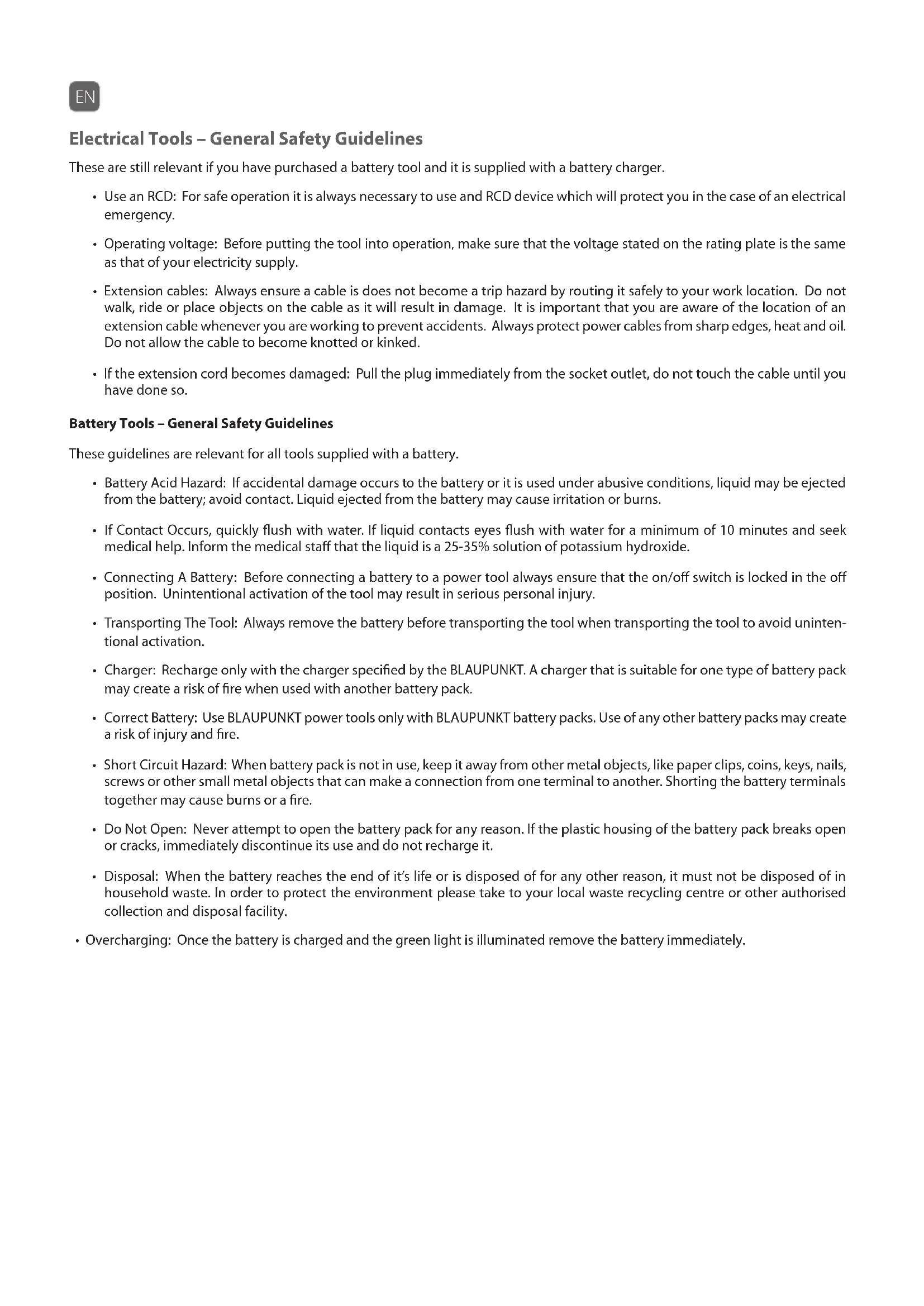 - Correct Battery: Use BLAUPUNKT power tools only with BLAUPUNKT battery packs. Use of any other battery packs may create a risk of injury and fire.