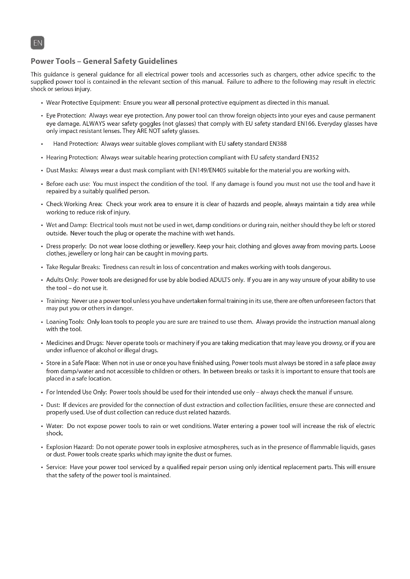 - Eye Protection: Always wear eye protection. Any power tool can throw foreign objects into your eyes and cause permanent eye damage. ALWAYS wear safety goggles (not glasses) that comply with EU safety standard EN166. Everyday glasses have only impact resistant lenses. They ARE NOT safety glasses.
