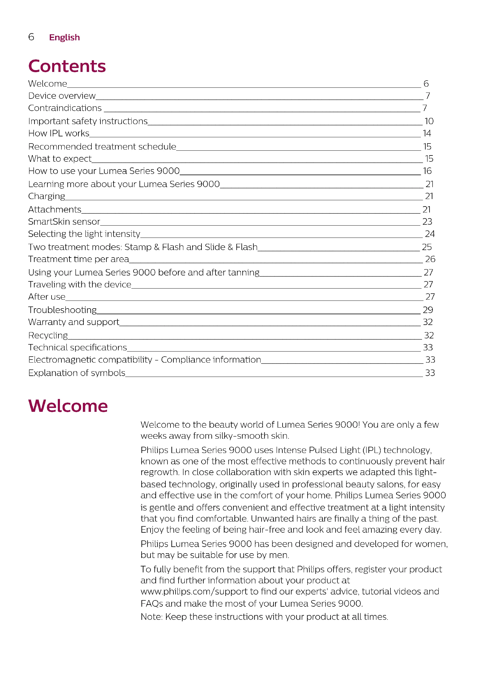 English Contents Welcome______________________________________________________________________________________________ 6 Device overview_______________________________________________________________________________________ 7 Contraindications ____________________________________________________________________________________ 7 Important safety instructions_________________________________________________________________________ 10 How IPL works________________________________________________________________________________________ 14 Recommended treatment schedule_________________________________________________________________ 15 What to expect________________________________________________________________________________________ 15 How to use your Lumea Series 9000________________________________________________________________ 16 Learning more about your Lumea Series 9000______________________________________________________ 21 Charging_______________________________________________________________________________________________ 21 Attachments__________________________________________________________________________________________ 21 SmartSkin sensor_____________________________________________________________________________________ 23 Selecting the light intensity___________________________________________________________________________ 24 Two treatment modes: Stamp & Flash and Slide & Flash___________________________________________ 25 Treatment time per area______________________________________________________________________________ 26 Using your Lumea Series 9000 before and after tanning___________________________________________ 27 Traveling with the device_____________________________________________________________________________ 27 After use_______________________________________________________________________________________________ 27 Troubleshooting______________________________________________________________________________________ 29 Warranty and support________________________________________________________________________________ 32 Recycling______________________________________________________________________________________________ 32 Technical specifications______________________________________________________________________________ 33 Electromagnetic compatibility - Compliance information___________________________________________ 33 Explanation of symbols_______________________________________________________________________________ 33 Welcome Welcome to the beauty world of Lumea Series 9000! You are only a few weeks away from silky-smooth skin. Philips Lumea Series 9000 uses Intense Pulsed Light (IPL) technology, known as one of the most effective methods to continuously prevent hair regrowth. In close collaboration with skin experts we adapted this light- based technology, originally used in professional beauty salons, for easy and effective use in the comfort of your home. Philips Lumea Series 9000 is gentle and offers convenient and effective treatment at a light intensity that you find comfortable. Unwanted hairs are finally a thing of the past. Enjoy the feeling of being hair-free and look and feel amazing every day. Philips Lumea Series 9000 has been designed and developed for women, but may be suitable for use by men. To fully benefit from the support that Philips offers, register your product and find further information about your product at www.philips.com/support to find our experts' advice, tutorial videos and FAQs and make the most of your Lumea Series 9000. Note: Keep these instructions with your product at all times.7 English Device overview 1 Light exit window with integrated UV filter 2 Attachments a Body attachment b Facial attachment c Bikini attachment (BRI957, BRI958) d Underarm attachment (BRI957, BRI958) e Precision attachment (BRI955 ) 3 SmartSkin sensor 4 Integrated safety system 5 Reflector inside the attachment 6 Electronic contacts 7 Opening for electronic contacts 8 Flash button 9 On/off button 10 Confirmation button 11 Toggle buttons 12 Intensity lights 13 Setting advice button 14 'READY to flash' light 15 Air vents 16 Device socket 17 Adapter 18 Small plug 19 Luxurious pouch (not shown) 20 Cleaning cloth (not shown) Contraindications Conditions Never use the device: