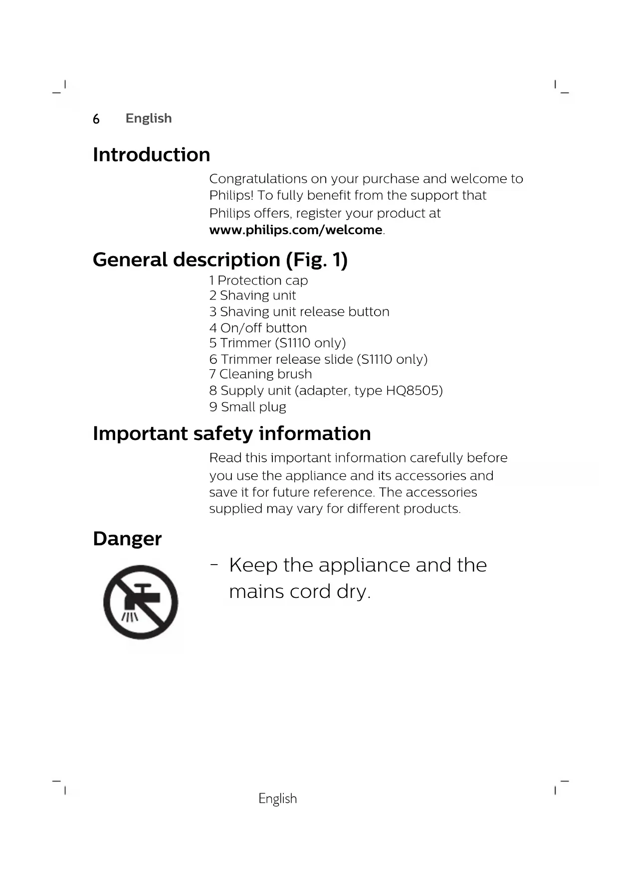 5empty page before TOCEnglish 6 Dansk 18 Deutsch 29 Español 42 Français 54 Nederlands 66 Norsk 78 Português 89 Suomi 101 Svenska 112 Türkçe 123 Ελληνικα 134English Introduction Congratulations on your purchase and welcome to Philips! To fully benefit from the support that Philips offers, register your product at www.philips.com/welcome. General description (Fig. 1) 1 Protection cap 2 Shaving unit 3 Shaving unit release button 4 On/off button 5 Trimmer (S1110 only) 6 Trimmer release slide (S1110 only) 7 Cleaning brush 8 Supply unit (adapter, type HQ8505) 9 Small plug Important safety information Read this important information carefully before you use the appliance and its accessories and save it for future reference. The accessories supplied may vary for different products. Danger