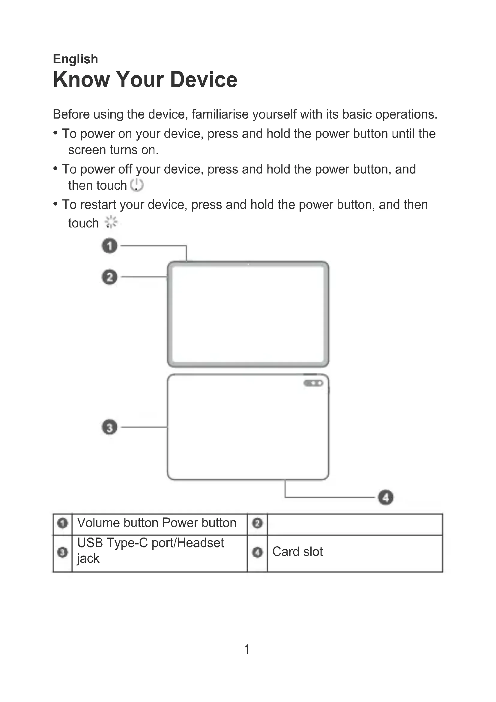 - To restart your device, press and hold the power button, and then touch . Volume button Power button USB Type-C port/Headset jack Card slot 1Getting Started