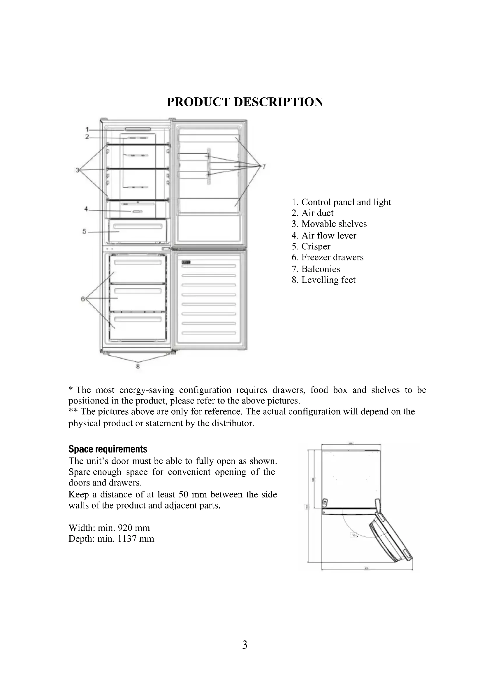 - The most energy-saving configuration requires drawers, food box and shelves to be positioned in the product, please refer to the above pictures. ** The pictures above are only for reference. The actual configuration will depend on the physical product or statement by the distributor. Space requirements The unit’s door must be able to fully open as shown. Spare enough space for convenient opening of the doors and drawers. Keep a distance of at least 50 mm between the side walls of the product and adjacent parts. Width: min. 920 mm Depth: min. 1137 mm4 USE ON/OFF key, used to switch on/off the appliance. SET key, used to adjust the temperature or to select the Super Cool function. Super Cool Icon, shows if the function is activated.