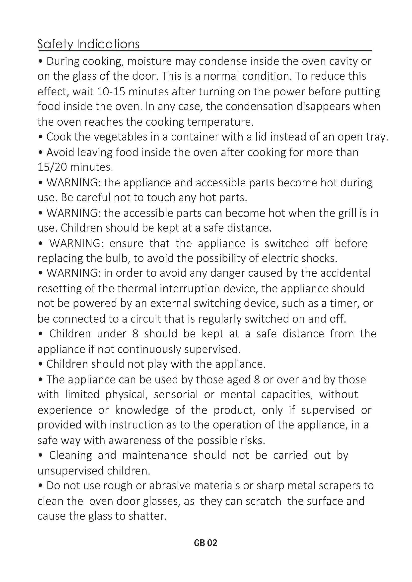 - Do not use rough or abrasive materials or sharp metal scrapers to clean the oven door glasses, as they can scratch the surface and cause the glass to shatter. GB 02GB 03