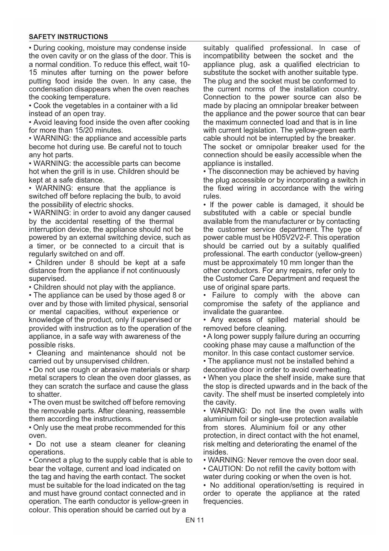 - lf the power cable is damaged, it should be substituted with a cable or special bundle available from the manufacturer or by contacting the customer service department. The type of power cable must be H05V2V2-F. This operation should be carried out by a suitably qualified professional. The earth conductor (yellow-green) must be approximately 10 mm longer than the other conductors. For any repairs, refer only to the Customer Care Department and request the use of original spare parts.
