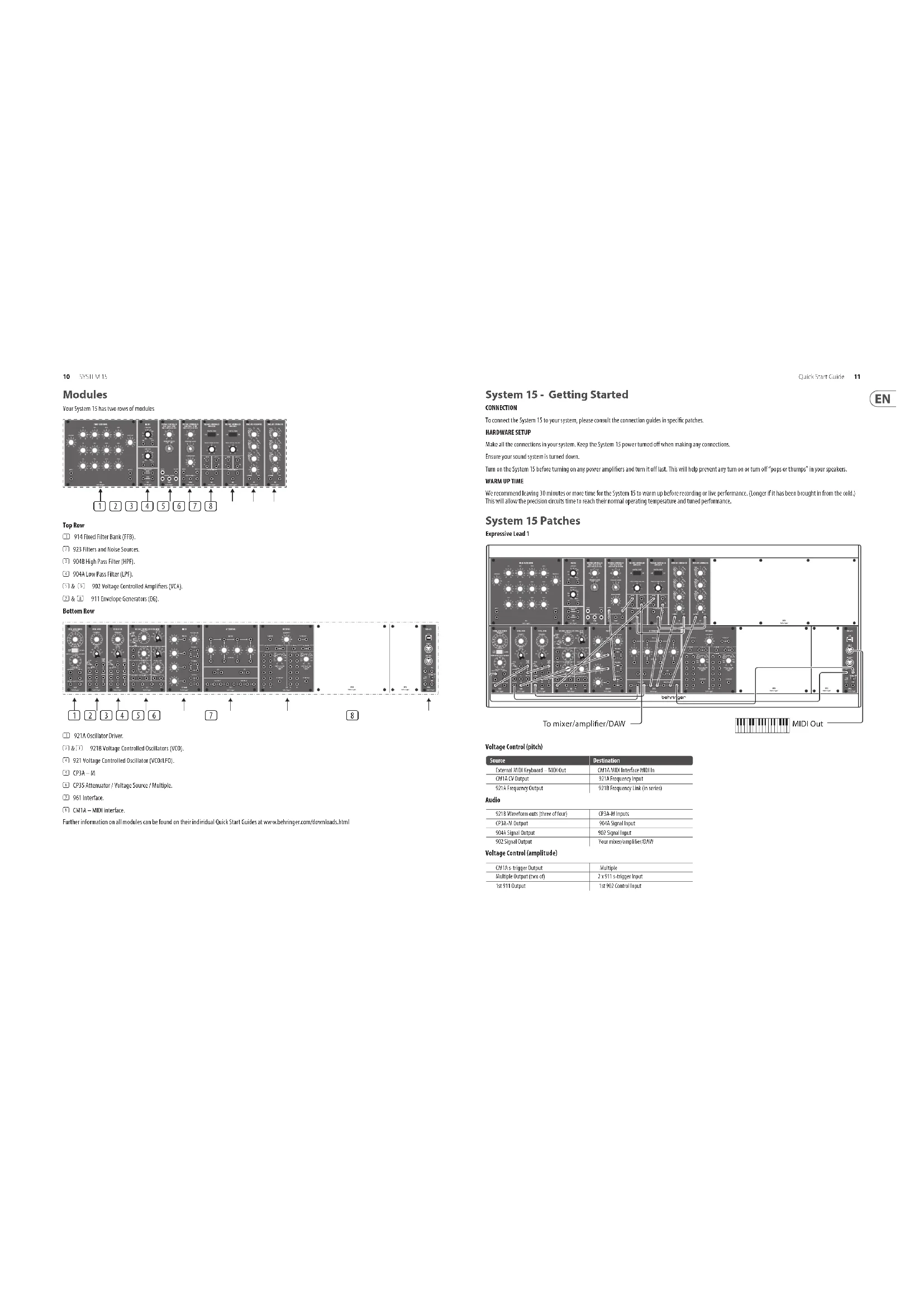 法律声明10 SYSTEM 15 Quick Start Guide 11 Modules Your System 15 has two rows of modules Top Row (1) 914 Fixed Filter Bank (FFB). (2) 923 Filters and Noise Sources. (3) 904B High Pass Filter (HPF). (4) 904A Low Pass Filter (LPF). (5) & (6) 902 Voltage Controlled Ampliers (VCA). (7) & (8) 911 Envelope Generators (EG). Bottom Row (1) 921A Oscillator Driver. (2) & (3) 921B Voltage Controlled Oscillators (VCO). (4) 921 Voltage Controlled Oscillator (VCO/LFO). (5) CP3A – M (6) CP35 Attenuator / Voltage Source / Multiple. (7) 961 Interface. (8) CM1A – MIDI interface. Further information on all modules can be found on their individual Quick Start Guides at www.behringer.com/downloads.html (1) (2) (3) (4) (5) (6) (7) (8) (1) (2) (3) (4) (5) (6) (7) (8) System 15 - Getting Started CONNECTION To connect the System 15 to your system, please consult the connection guides in specic patches. HARDWARE SETUP Make all the connections in your system. Keep the System 15 power turned o when making any connections. Ensure your sound system is turned down. Turn on the System 15 before turning on any power ampliers and turn it o last. This will help prevent any turn on or turn o “pops or thumps” in your speakers.