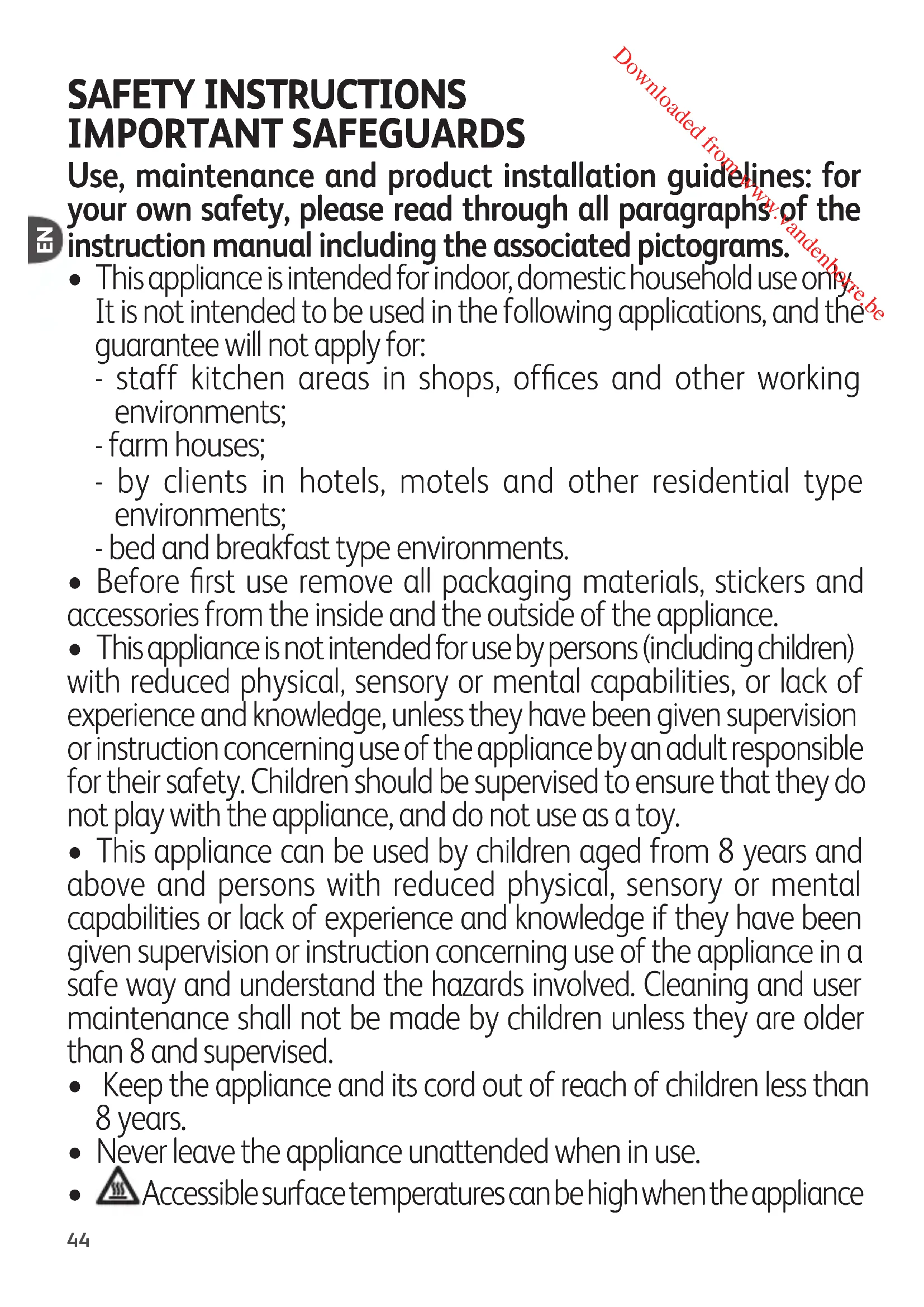 - Only use parts or accessories provided with the appliance or bought from an Approved Service Centre. Do not use them for other appliances or intention. Downloaded from www.vandenborre.be46