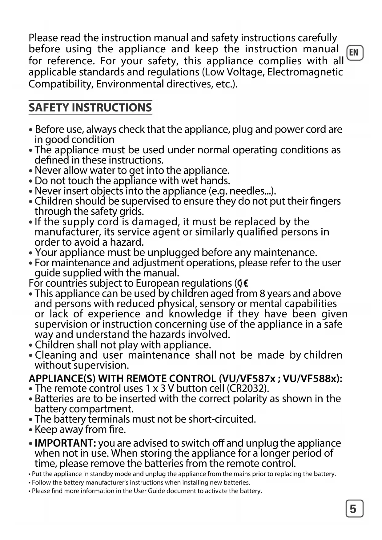 - Cleaning and user maintenance shall not be made by children without supervision. APPLIANCE(S) WITH REMOTE CONTROL (VU/VF587x ; VU/VF588x):