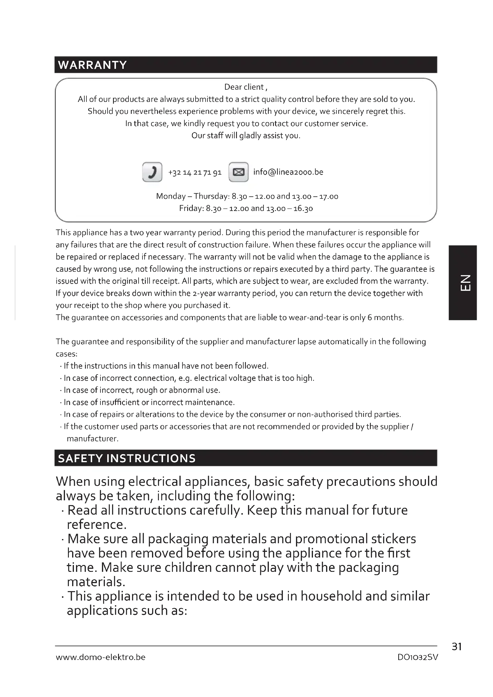 WARRANTY Dear client , All of our products are always submitted to a strict quality control before they are sold to you. Should you nevertheless experience problems with your device, we sincerely regret this. In that case, we kindly request you to contact our customer service. Our sta will gladly assist you. +32 14 21 71 91 info@linea2000.be Monday – Thursday: 8.30 – 12.00 and 13.00 – 17.00 Friday: 8.30 – 12.00 and 13.00 – 16.30 This appliance has a two year warranty period. During this period the manufacturer is responsible for any failures that are the direct result of construction failure. When these failures occur the appliance will be repaired or replaced if necessary. The warranty will not be valid when the damage to the appliance is caused by wrong use, not following the instructions or repairs executed by a third party. The guarantee is issued with the original till receipt. All parts, which are subject to wear, are excluded from the warranty. If your device breaks down within the 2-year warranty period, you can return the device together with your receipt to the shop where you purchased it. The guarantee on accessories and components that are liable to wear-and-tear is only 6 months. The guarantee and responsibility of the supplier and manufacturer lapse automatically in the following cases: