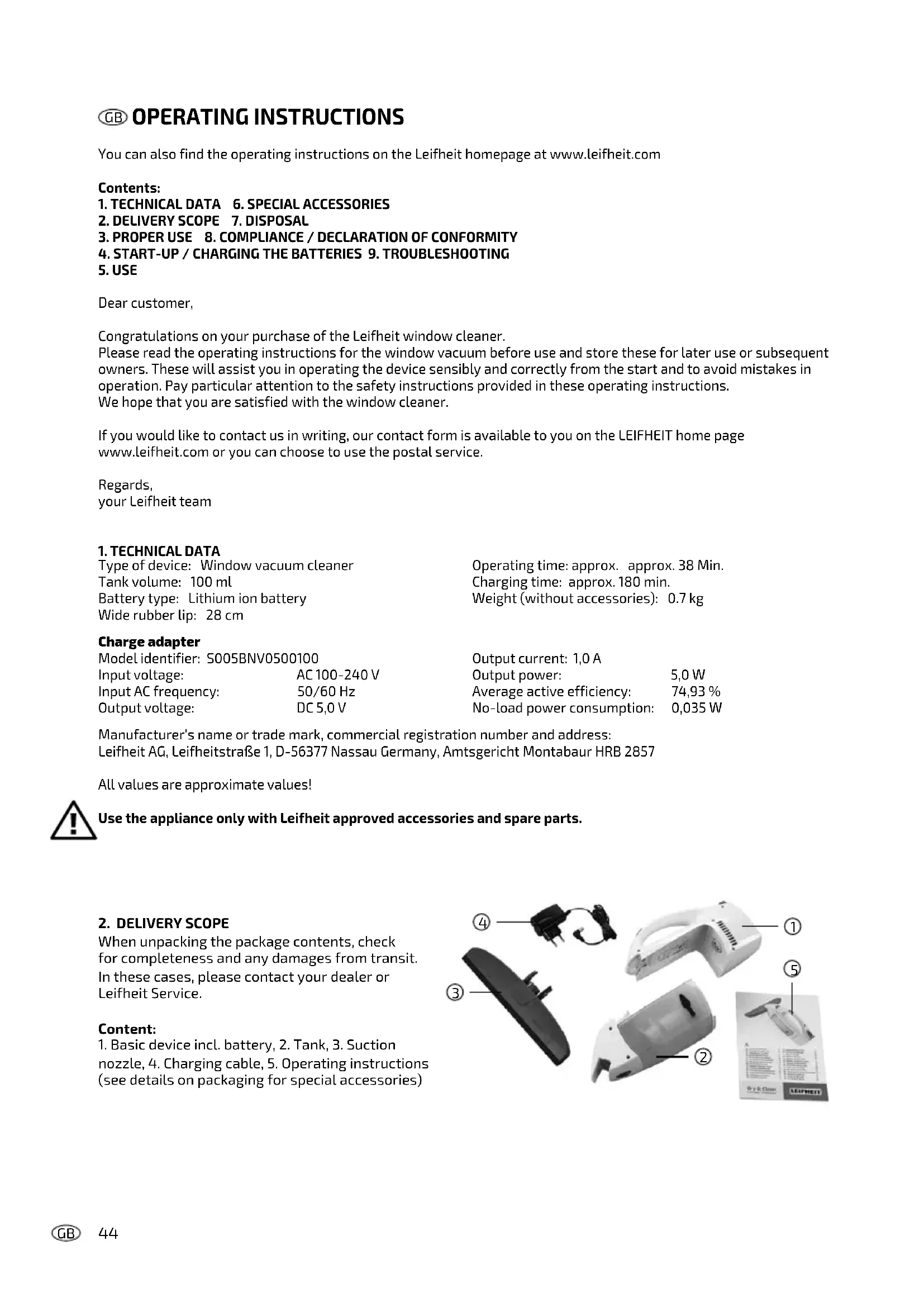 Manufacturer’s name or trade mark, commercial registration number and address: Leifheit AG, Leifheitstraße 1, D-56377 Nassau Germany, Amtsgericht Montabaur HRB 2857 All values are approximate values! Use the appliance only with Leifheit approved accessories and spare parts. Type of device: Window vacuum cleaner Tank volume: 100 ml Battery type: Lithium ion battery Wide rubber lip: 28 cm Operating time: approx. approx. 38 Min. Charging time: approx. 180 min. Weight (without accessories): 0.7 kg Charge adapter Model identifier: S005BNV0500100 Input voltage: AC 100-240 V Input AC frequency: 50/60 Hz Output voltage: DC 5,0 V Output current: 1,0 A Output power: 5,0 W Average active efficiency: 74,93 % No-load power consumption: 0,035 W45