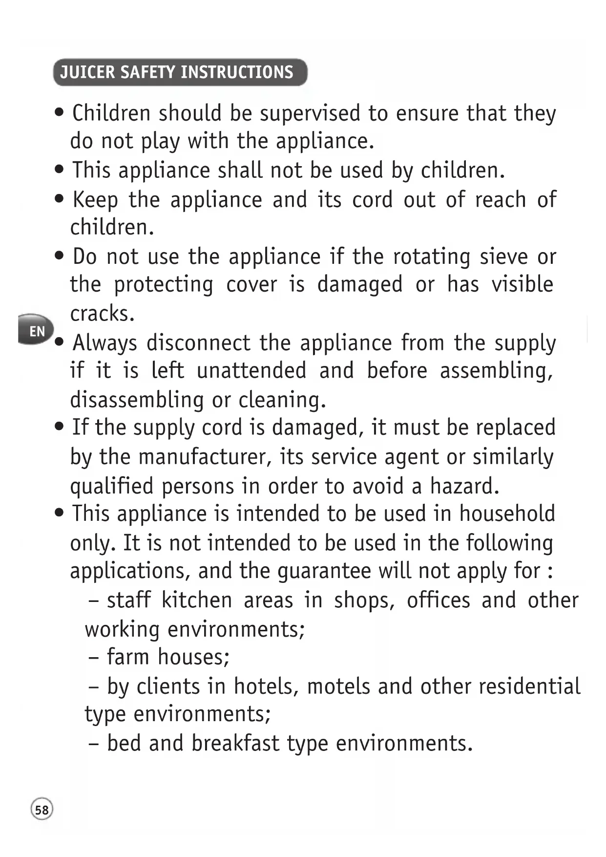 - This appliance is intended to be used in household only. It is not intended to be used in the following applications, and the guarantee will not apply for : – staff kitchen areas in shops, offices and other working environments; – farm houses; – by clients in hotels, motels and other residential type environments; – bed and breakfast type environments.59