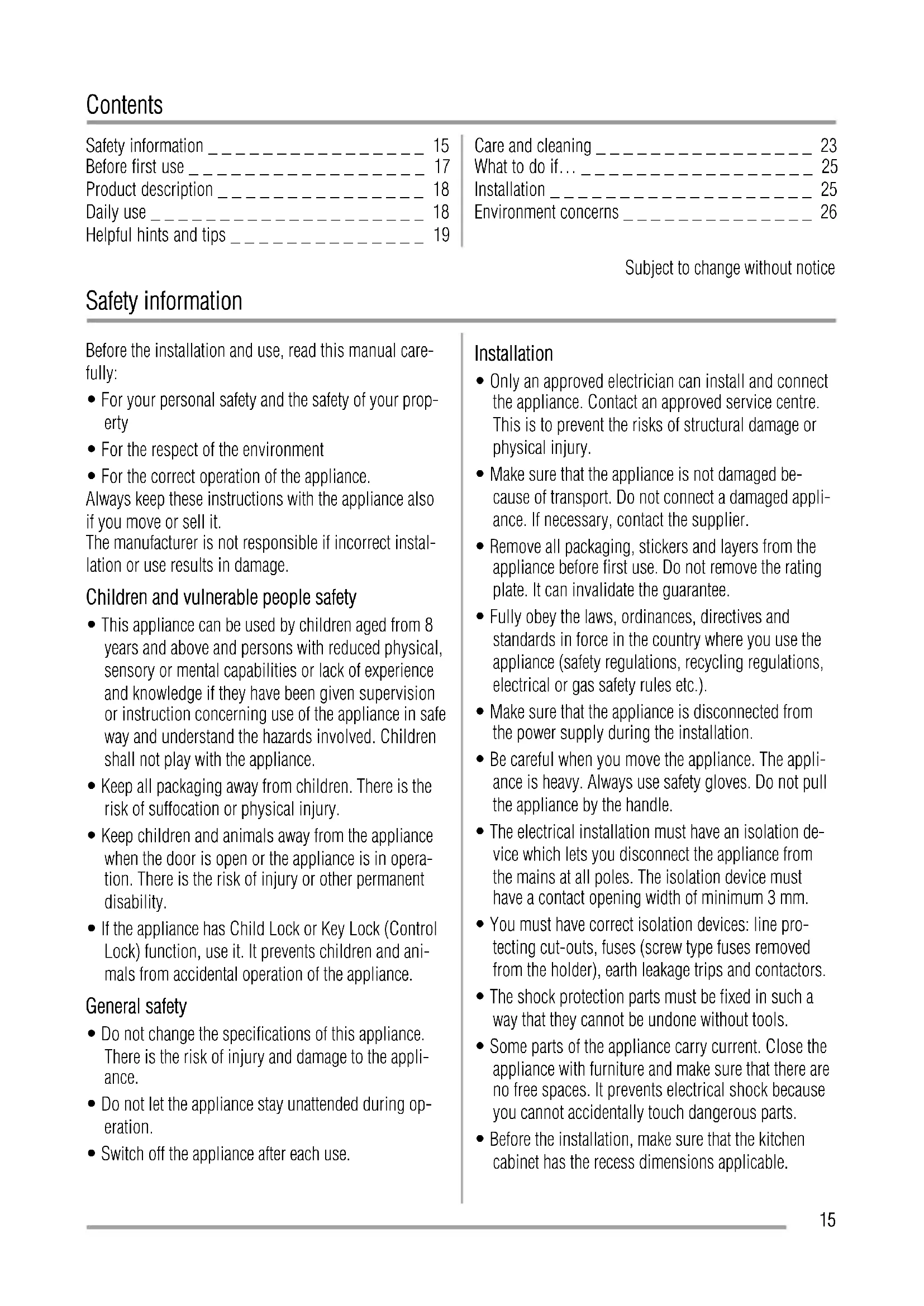Electrical installation Warning! Only a qualified and competent person must do the electrical installation. The manufacturer is not responsible if you do not follow safety precautions from chapter "Safety". This appliance is supplied without a main plug and a main cable. The cable Cable types applicable for installation or replacement: H07 RN-F, H05 RN-F, H05 RRF, H05 VV-F, H05 V2V2- F (T90), H05 BB-F. For the section of the cable refer to the total power (on the rating plate) and to the table: Total power Section of the cable maximum 1380 W 3 x 0,75 mm² maximum 2300 W 3 x 1 mm² maximum 3680 W 3 x 1,5 mm² The hearth cord (green/yellow cable) must be 2 cm lon- ger than phase and neutral cables (blue and brown ca- bles). Environment concerns The symbol on the product or on its packaging indicates that this product may not be treated as household waste. Instead it should be taken to the appropriate collection point for the recycling of electrical and electronic equipment. By ensuring this product is disposed of correctly, you will help prevent potential negative consequences for the environment and human health, which could otherwise be caused by inappropriate waste handling of this product. For more detailed information about recycling of this product, please contact your local council, your household waste disposal service or the shop where you purchased the product. Packaging material The packaging material is environmentally-friend- ly and recyclable. Plastic parts are marked with interna- tional abbreviations such as PE, PS, etc. Dispose of the packaging material in the containers provided for this purpose at your local waste management facility. 26Sommaire Consignes de sécurité _ _ _ _ _ _ _ _ _ _ _ _ _ _ 27 Avant la première utilisation _ _ _ _ _ _ _ _ _ _ _ 30 Description de l'appareil _ _ _ _ _ _ _ _ _ _ _ _ _ 30 Utilisation quotidienne _ _ _ _ _ _ _ _ _ _ _ _ _ _ 31 Conseils utiles _ _ _ _ _ _ _ _ _ _ _ _ _ _ _ _ _ 31 Entretien et nettoyage _ _ _ _ _ _ _ _ _ _ _ _ _ _ 36 En cas d'anomalie de fonctionnement _ _ _ _ _ _ _ 38 Installation _ _ _ _ _ _ _ _ _ _ _ _ _ _ _ _ _ _ _ 38 En matière de protection de l'environnement _ _ _ 39 Sous réserve de modifications Consignes de sécurité Lisez attentivement cette notice d'utilisation avant l'ins- tallation et l'utilisation de l'appareil :