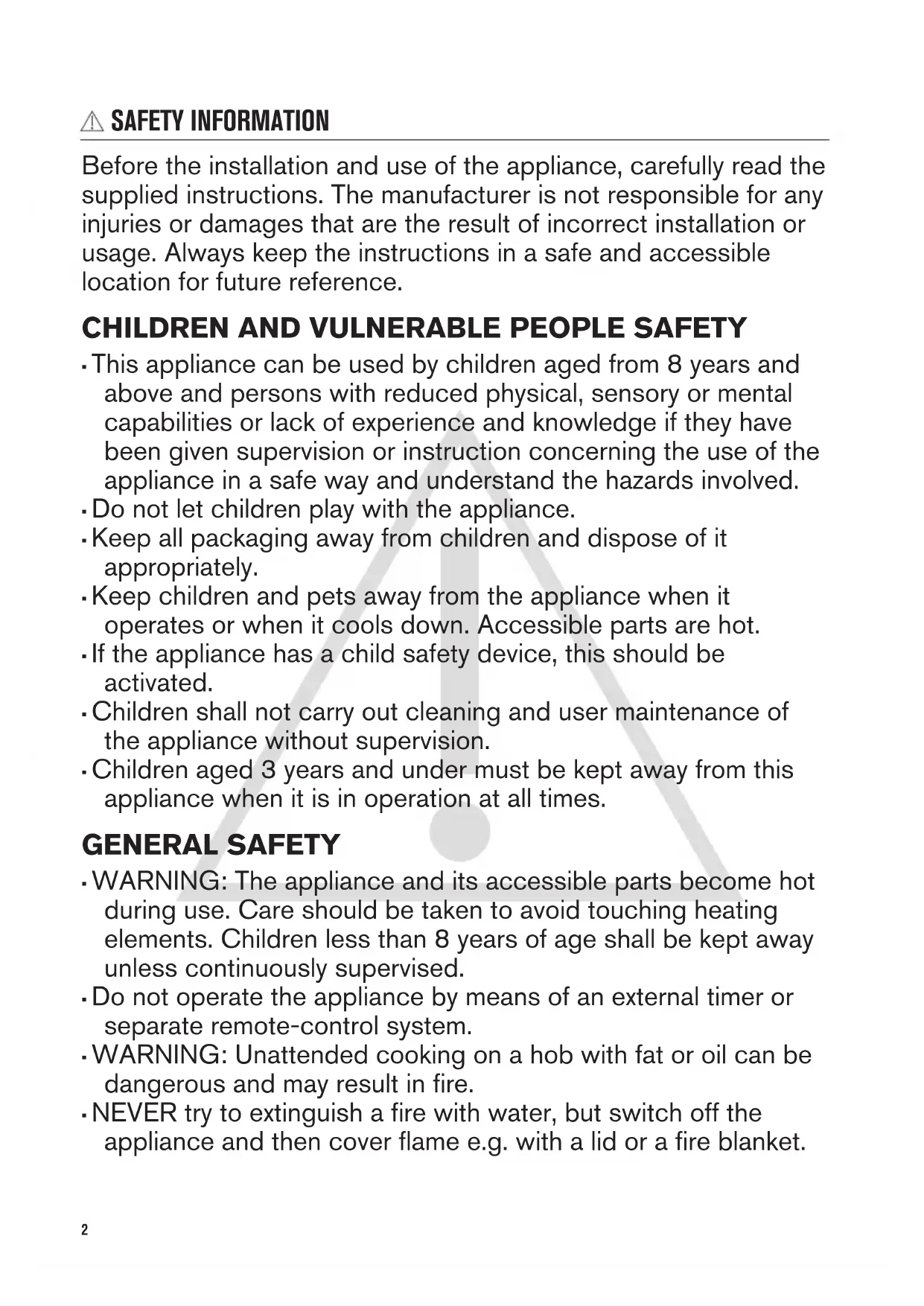 - NEVER try to extinguish a fire with water, but switch off the appliance and then cover flame e.g. with a lid or a fire blanket. 2• CAUTION: The cooking process has to be supervised. A short term cooking process has to be supervised continuously.