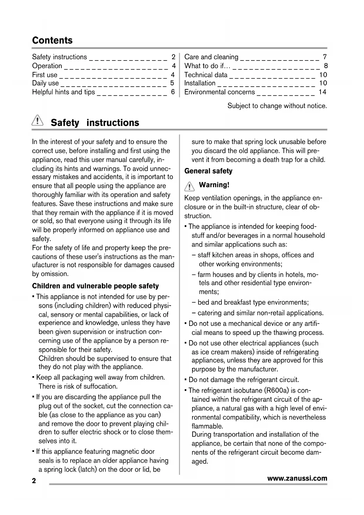 Manual de instrucciones 58 Fridge-Freezer Réfrigérateur/congélateur Kühl-Gefrierschrank Frigorifero-Congelatore Frigorífico-congelador ZBT23420SRContents Safety instructions _ _ _ _ _ _ _ _ _ _ _ _ _ _ 2 Operation _ _ _ _ _ _ _ _ _ _ _ _ _ _ _ _ _ _ _ 4 First use _ _ _ _ _ _ _ _ _ _ _ _ _ _ _ _ _ _ _ _ 4 Daily use _ _ _ _ _ _ _ _ _ _ _ _ _ _ _ _ _ _ _ _ 5 Helpful hints and tips _ _ _ _ _ _ _ _ _ _ _ _ _ 6 Care and cleaning _ _ _ _ _ _ _ _ _ _ _ _ _ _ _ 7 What to do if… _ _ _ _ _ _ _ _ _ _ _ _ _ _ _ _ 8 Technical data _ _ _ _ _ _ _ _ _ _ _ _ _ _ _ _ 10 Installation _ _ _ _ _ _ _ _ _ _ _ _ _ _ _ _ _ _ 10 Environmental concerns _ _ _ _ _ _ _ _ _ _ _ 14 Subject to change without notice. Safety instructions In the interest of your safety and to ensure the correct use, before installing and first using the appliance, read this user manual carefully, in- cluding its hints and warnings. To avoid unnec- essary mistakes and accidents, it is important to ensure that all people using the appliance are thoroughly familiar with its operation and safety features. Save these instructions and make sure that they remain with the appliance if it is moved or sold, so that everyone using it through its life will be properly informed on appliance use and safety. For the safety of life and property keep the pre- cautions of these user's instructions as the man- ufacturer is not responsible for damages caused by omission. Children and vulnerable people safety