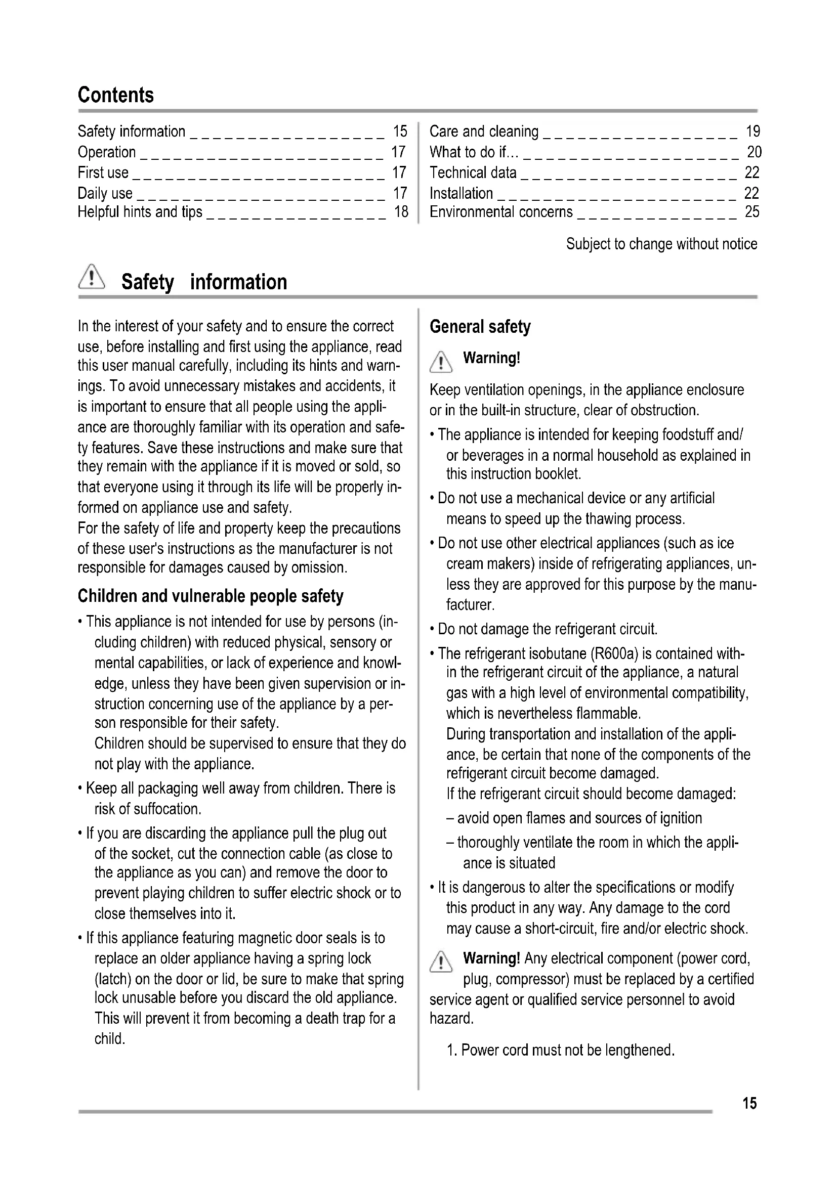 - If this appliance featuring magnetic door seals is to replace an older appliance having a spring lock (latch) on the door or lid, be sure to make that spring lock unusable before you discard the old appliance. This will prevent it from becoming a death trap for a child. General safety Warning! Keep ventilation openings, in the appliance enclosure or in the built-in structure, clear of obstruction.
