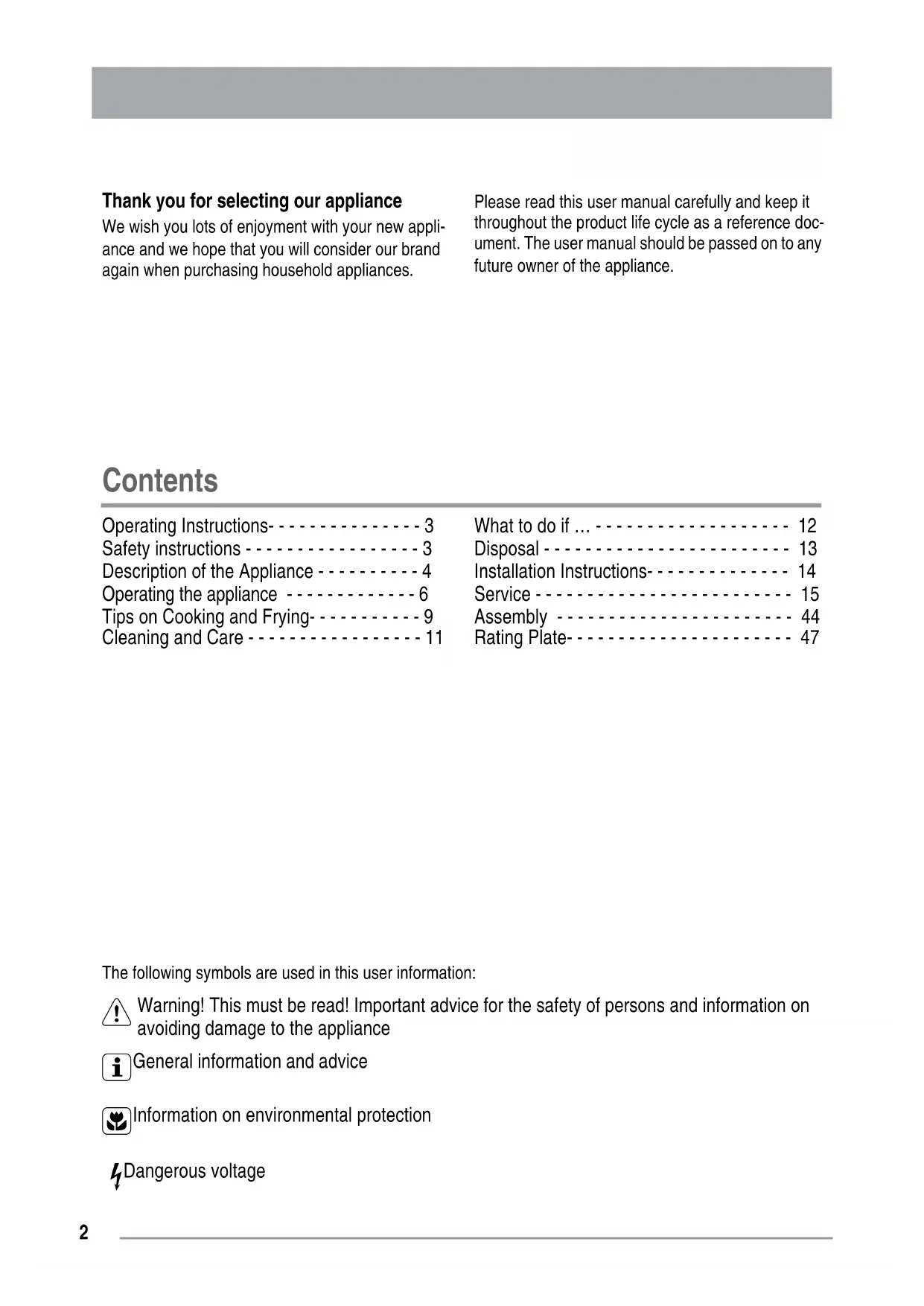Warning! This must be read! Important advice for the safety of persons and information on avoiding damage to the appliance 3 General information and advice 2 Information on environmental protection z Dangerous voltage3