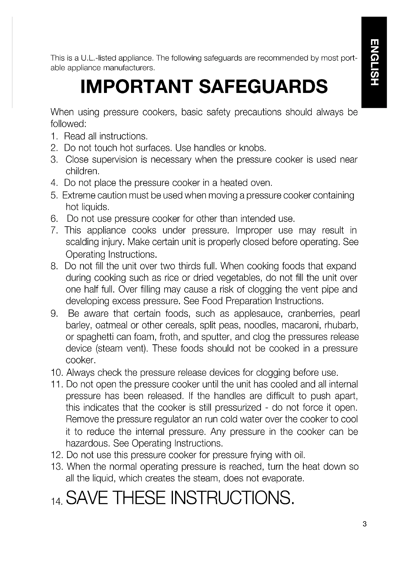SAVE THESE INSTRUCTIONS. This is a U.L.-listed appliance. The following safeguards are recommended by most port- able appliance manufacturers. IMPORTANT SAFEGUARDS ENGLISH4