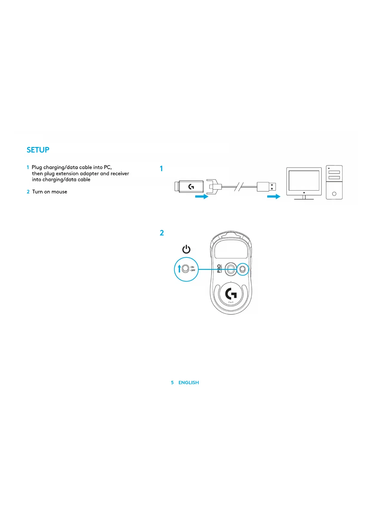 55 ENGLISH SETUP 1 Plug charging/data cable into PC, thenplugextension adapter and receiver intocharging/data cable 2 Turn on mouse