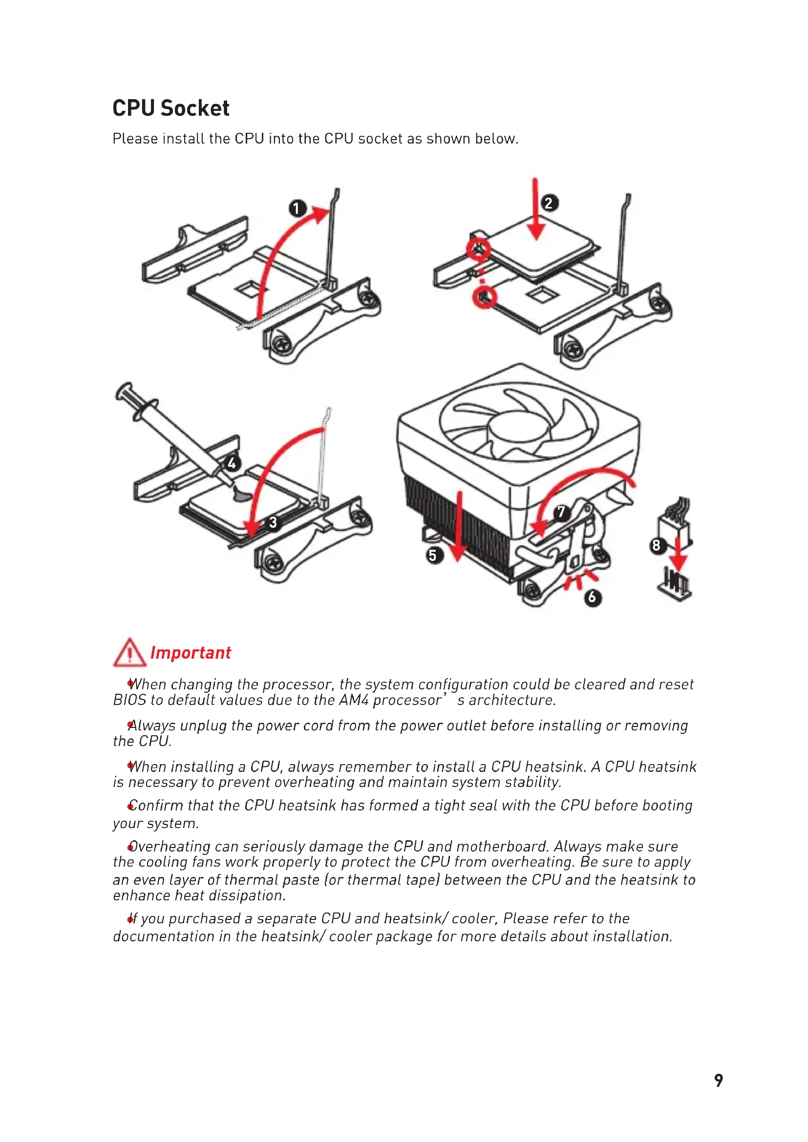 If you purchased a separate CPU and heatsink/ cooler, Please refer to the documentation in the heatsink/ cooler package for more details about installation.