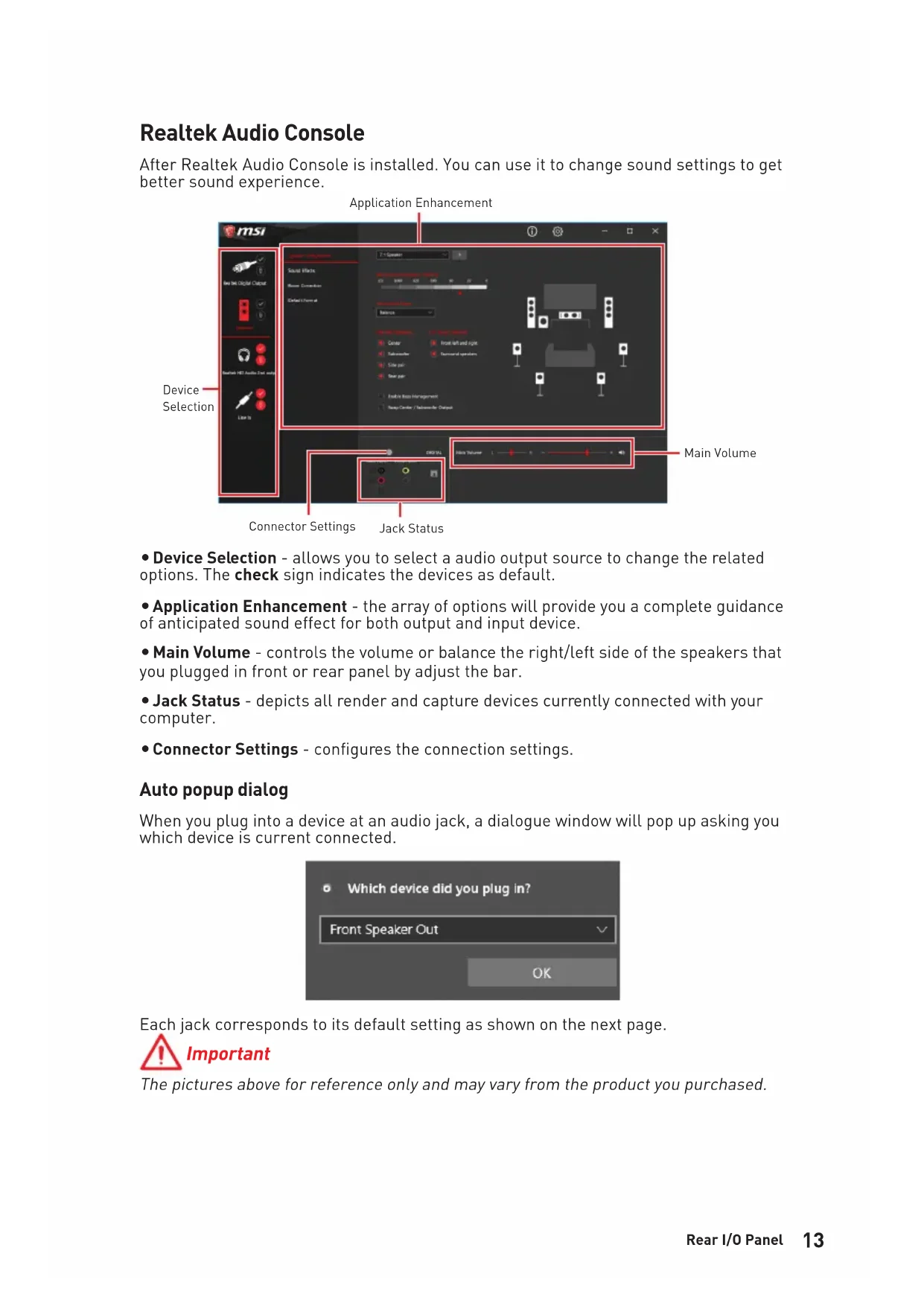 - 20% brightness is recommended when the number of LED strips exceeds 8. HD120 RGB Fan 6SP120 RGB Fan 6LL120 RGB Fan 6 Package contents Please check the contents of your motherboard package. It should contain:Motherboard MEG X570 ACECableSATA 6Gb/s Cables 41 to 2 RGB LED Extension Y Cable 80cm 1CORSAIR RGB LED Extension Cable 50cm 1RAINBOW RGB LED Extension Cable 80cm 1AccessoriesAntenna Set 18.5H M.2 screws 3Case Badge 1SATA Cable Labels 1Product Registration Card 1Application DVD Driver DVD 1DocumentationUser Manual 1Quick Installation Guide 1 Important If any of the above items are damaged or missing, please contact your retailer.12 Rear I/O Panel USB 3.2 Gen 2 Type-C* USB 3.2 Gen 2 Type-A* Link/ Activity LED Status DescriptionOff No linkYellow LinkedBlinking Data activity Speed LED Status Gigabit LAN 2.5 Gbps LANOff 10 Mbps 10 MbpsGreen 100 Mbps 100 Mbps / 1 Gbps Orange 1 Gbps 2.5 Gbps LAN Port LED Status Table Audio Ports Configuration Audio Ports Channel 2 4 6 8Center/ Subwoofer Out ● ●Rear Speaker Out ● ● ●Line-In/ Side Speaker Out ●Line-Out/ Front Speaker Out ● ● ● ●Mic In (●: connected, Blank: empty) Rear I/O Panel PS/2 Combo port LAN 2.5 Gbps LAN USB 2.0 Type-A Audio Ports Optical S/PDIF-Out Clear CMOS button Wi-Fi Antenna connectors USB 3.2 Gen 2 Type-A USB 3.2 Gen1 Type-A Flash BIOS Button *USB 3.2 Gen2 (3rd Gen AMD Ryzen™) or USB 3.2 Gen1 (2nd Gen AMD Ryzen™/ Ryzen™ with Radeon™ Vega Graphics and 2nd Gen AMD Ryzen™ with Radeon™ Graphics) y Clear CMOS button - Power off your computer. Press and hold the Clear CMOS button for about 5-10 seconds to reset BIOS to default values. y Flash BIOS Port/ Button - Please refer to page 44 for Updating BIOS with Flash BIOS Button. Flash BIOS Port13 Rear I/O Panel Realtek Audio Console After Realtek Audio Console is installed. You can use it to change sound settings to get better sound experience. y Device Selection - allows you to select a audio output source to change the related options. The check sign indicates the devices as default. y Application Enhancement - the array of options will provide you a complete guidance of anticipated sound effect for both output and input device. y Main Volume - controls the volume or balance the right/left side of the speakers that you plugged in front or rear panel by adjust the bar. y Jack Status - depicts all render and capture devices currently connected with your computer. y Connector Settings - configures the connection settings. Auto popup dialog When you plug into a device at an audio jack, a dialogue window will pop up asking you which device is current connected.Each jack corresponds to its default setting as shown on the next page. Important The pictures above for reference only and may vary from the product you purchased. Jack StatusConnector Settings Device SelectionMain VolumeApplication Enhancement14 Rear I/O Panel Audio jacks to headphone and microphone diagram Audio jacks to stereo speakers diagram Audio jacks to 7.1-channel speakers diagram AUDIO INPUT AUDIO INPUT Rear Front Side Center/ Subwoofer15 Rear I/O Panel Installing Antennas