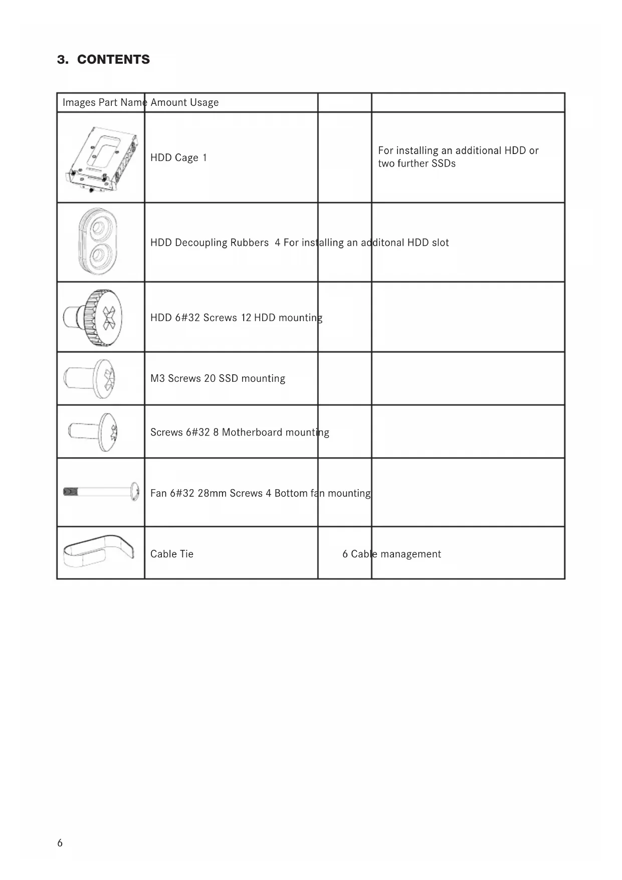 Images Part Name Amount Usage HDD Cage 1 For installing an additional HDD or two further SSDs HDD Decoupling Rubbers 4 For installing an additonal HDD slot HDD 6#32 Screws 12 HDD mounting M3 Screws 20 SSD mounting Screws 6#32 8 Motherboard mounting