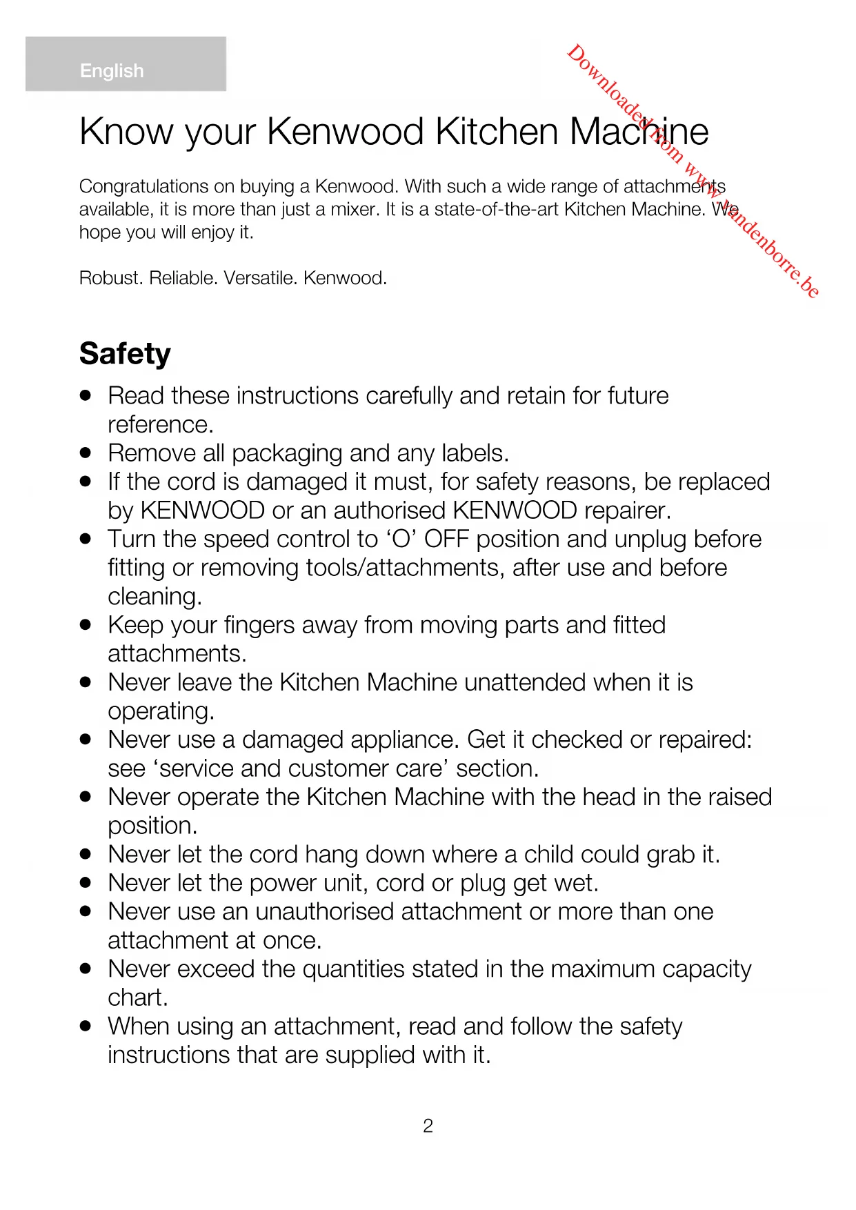 Downloaded from www.vandenborre.beKnow your Kenwood Kitchen Machine Congratulations on buying a Kenwood. With such a wide range of attachments available, it is more than just a mixer. It is a state-of-the-art Kitchen Machine. We hope you will enjoy it. Robust. Reliable. Versatile. Kenwood.