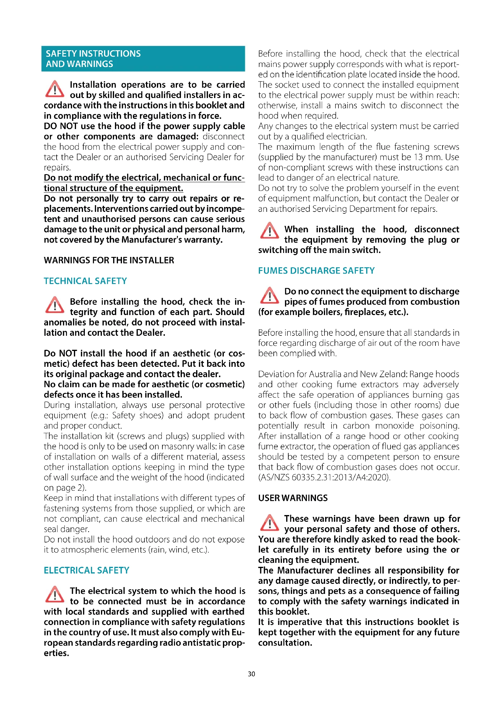 Do no connect the equipment to discharge pipes of fumes produced from combustion (for example boilers, replaces, etc.). Before installing the hood, ensure that all standards in force regarding discharge of air out of the room have been complied with. Deviation for Australia and New Zeland: Range hoods and other cooking fume extractors may adversely affect the safe operation of appliances burning gas or other fuels (including those in other rooms) due to back flow of combustion gases. These gases can potentially result in carbon monoxide poisoning. After installation of a range hood or other cooking fume extractor, the operation of flued gas appliances should be tested by a competent person to ensure that back flow of combustion gases does not occur. (AS/NZS 60335.2.31:2013/A4:2020). USER WARNINGS These warnings have been drawn up for your personal safety and those of others. You are therefore kindly asked to read the book- let carefully in its entirety before using the or cleaning the equipment. The Manufacturer declines all responsibility for any damage caused directly, or indirectly, to per- sons, things and pets as a consequence of failing to comply with the safety warnings indicated in this booklet. It is imperative that this instructions booklet is kept together with the equipment for any future consultation.31 ENGLISH If the equipment is sold or transferred to another per- son, make sure that the booklet is also supplied so that the new user can be made aware of the hood's operation and relative warnings. After the stainless steel hood has been installed, it will need to be cleaned to remove any residues re- maining from the protection adhesive as well as any grease and oil stains which, if not removed, can cause irreversible damage to the hood surface. To properly clean the unit, the manufacturer recommends using the supplied moist wipes, which are also available sold separately. Insist on original spare parts. INTENDED USE The equipment is solely intended to be used to extract fumes generated from cooking food in non-professional domestic kitchens: any other use is improper. Improper use can cause damage to persons, things, pets and exempts the Manu- facturer from any liability. The equipment can be used by children over the age of 8 and by persons with reduced physical, sensory and mental abilities, or with no experience or knowl- edge, as long as they do so under supervision or after having received relative instructions regarding safe use of the equipment and understanding of the dan- gers connected to it. Children are not to play with the equipment. Clean- ing and maintenance by the user must not be carried out by children without supervision.