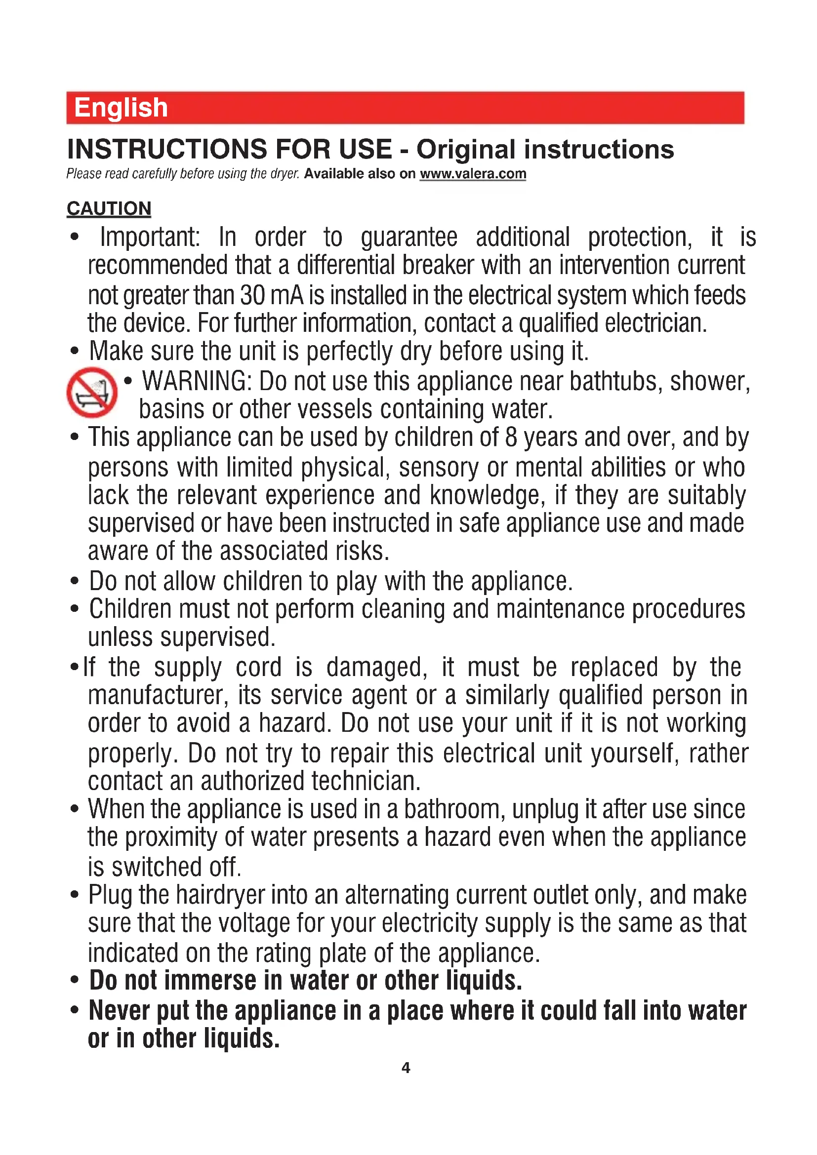 ʮʬʩʩʹʡʩ ʸʲʩʹ 00060713_19-03_Layout 1 29/01/2019 11:19 Pagina 34 INSTRUCTIONS FOR USE - Original instructions Please read carefully before using the dryer. Available also on www.valera.com CAUTION