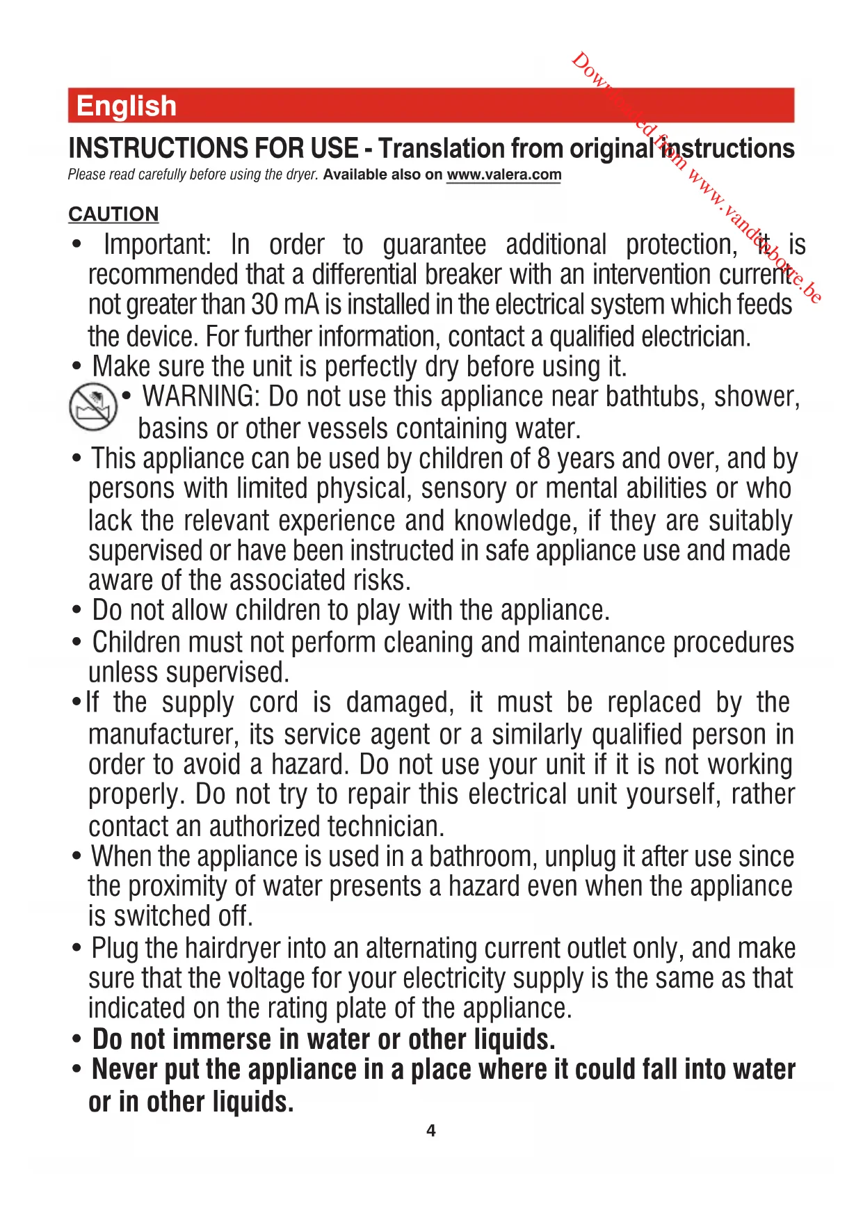 ʮʬʩʩʹʡʩ ʸʲʩʹ Downloaded from www.vandenborre.be4 INSTRUCTIONS FOR USE - Translation from original instructions Please read carefully before using the dryer. Available also on www.valera.com CAUTION