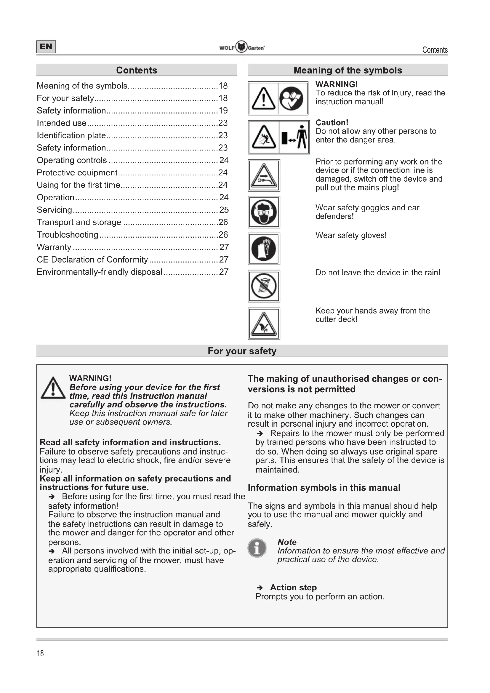 - Environmentally-friendly disposal Meaning of the symbols WARNING! To reduce the risk of injury, read the instruction manual! Caution! Do not allow any other persons to enter the danger area. Prior to performing any work on the device or if the connection line is damaged, switch o the device and pull out the mains plug! Wear safety goggles and ear defenders! Wear safety gloves! Do not leave the device in the rain! Keep your hands away from the cutter deck! For your safety WARNING! Before using your device for the rst time, read this instruction manual carefully and observe the instructions. Keep this instruction manual safe for later use or subsequent owners. Read all safety information and instructions. Failure to observe safety precautions and instruc- tions may lead to electric shock, re and/or severe injury. Keep all information on safety precautions and instructions for future use. Î Before using for the rst time, you must read the safety information! Failure to observe the instruction manual and the safety instructions can result in damage to the mower and danger for the operator and other persons. Î All persons involved with the initial set-up, op- eration and servicing of the mower, must have appropriate qualications. The making of unauthorised changes or con- versions is not permitted Do not make any changes to the mower or convert it to make other machinery. Such changes can result in personal injury and incorrect operation. Î Repairs to the mower must only be performed by trained persons who have been instructed to do so. When doing so always use original spare parts. This ensures that the safety of the device is maintained. Information symbols in this manual The signs and symbols in this manual should help you to use the manual and mower quickly and safely. Note Information to ensure the most eective and practical use of the device. Î Action step Prompts you to perform an action.For your safety p. 27