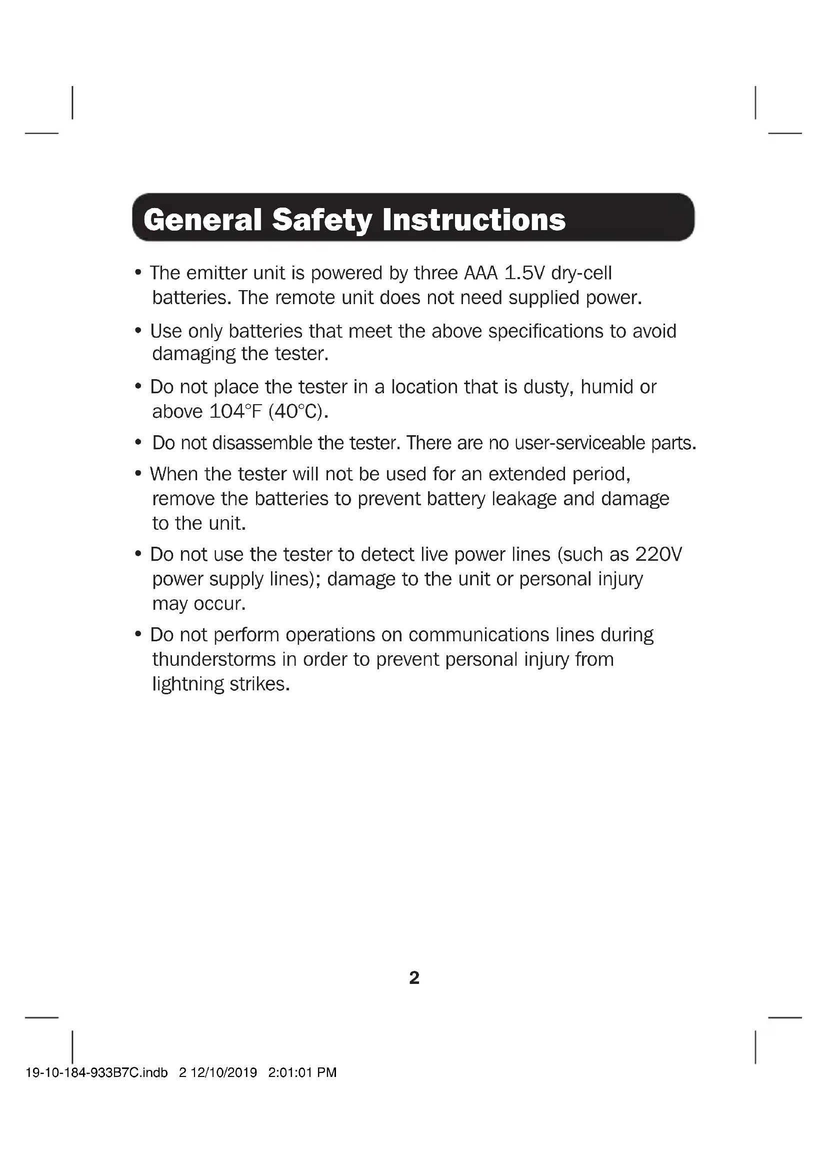 This test is to check voltage, current and power between the power adapter and the powered device. Connect the power adapter to device and choose “Power” at the main menu. The results will display immediately. 19-10-184-933B7C.indb 13 12/10/2019 2:01:03 PM14 Loop-Back Test Lighting Function This test checks whether the loopback of the network cable that is connected to the switch is functioning properly. Connect the switch port to the loop-back port of the emitter with a network cable. If the indicator is on, the loop is proper. If the indicator is off, problems exist within the loop. Press the Light key to turn on or turn off the light. 19-10-184-933B7C.indb 14 12/10/2019 2:01:04 PM15 Settings Language Settings English is the only language setting available. Backlight Settings Adjust the backlight time among 15 seconds, 30 seconds, 60 seconds, long light and off. Auto-Off Time Adjust the backlight time among 15 minutes, 30 minutes, 1 hour, OFF. 19-10-184-933B7C.indb 15 12/10/2019 2:01:04 PM16 Settings Contrast Settings Press the left and right keys to adjust the contrast until the desired contrast is displayed. Version Information Displays the current version information of software and hardware. 19-10-184-933B7C.indb 16 12/10/2019 2:01:04 PM17 Warranty
