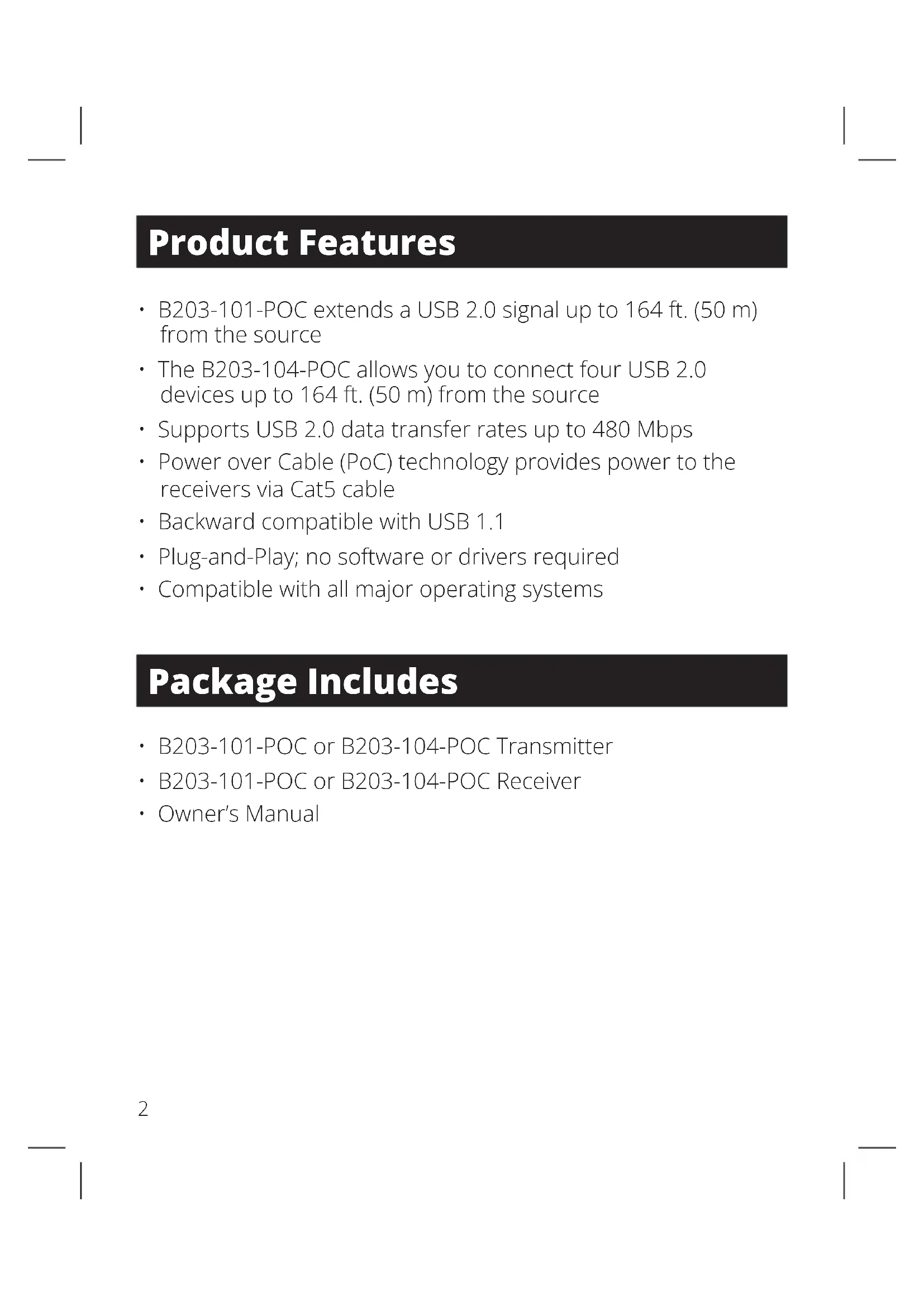- When connecting the receiver to high-power device(s), add external power via its USB Micro-B port.5 Specications Specication B203-101-POC B203-104-POC Supported USB Versions USB 2.0 (480 Mbps), USB 1.1 (12 Mbps) Transmitter Ports (x1) RJ45 Receiver Ports (x1) RJ45 ; (x1) USB-A ; (x1) USB Micro-B (x1) RJ45 ; (x4) USB-A ; (x1) USB Micro-B Transmitter Plug USB-A Maximum Extension Distance 164 ft. (50 m) Operating Temperature 32°F to 122°F (0° to 50°C) Storage Temperature -4°F to 158°F (-20° to 70°C) Transmitter Dimensions [H x W x D]