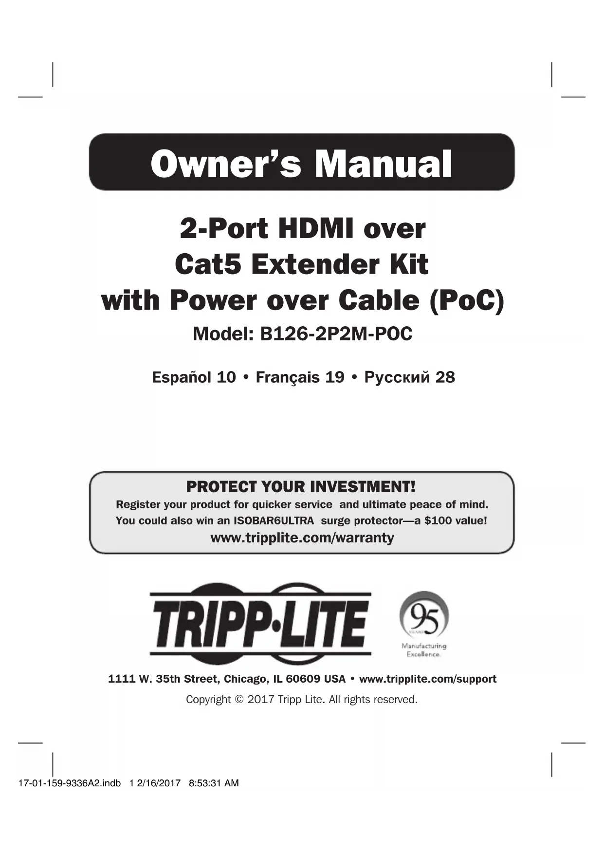 11111 W. 35th Street, Chicago, IL 60609 USA • www.tripplite.com/supportCopyright © 2017 Tripp Lite. All rights reserved. Owner’s Manual 2-Port HDMI over Cat5 Extender Kit with Power over Cable (PoC) Model: B126-2P2M-POC PROTECT YOUR INVESTMENT! Register your product for quicker service and ultimate peace of mind. You could also win an ISOBAR6ULTRA surge protector—a $100 value! www.tripplite.com/warranty Español 10 • Français 19 • Pусский 28 17-01-159-9336A2.indb 1 2/16/2017 8:53:31 AM2 Product Features Package Contents Optional Accessories