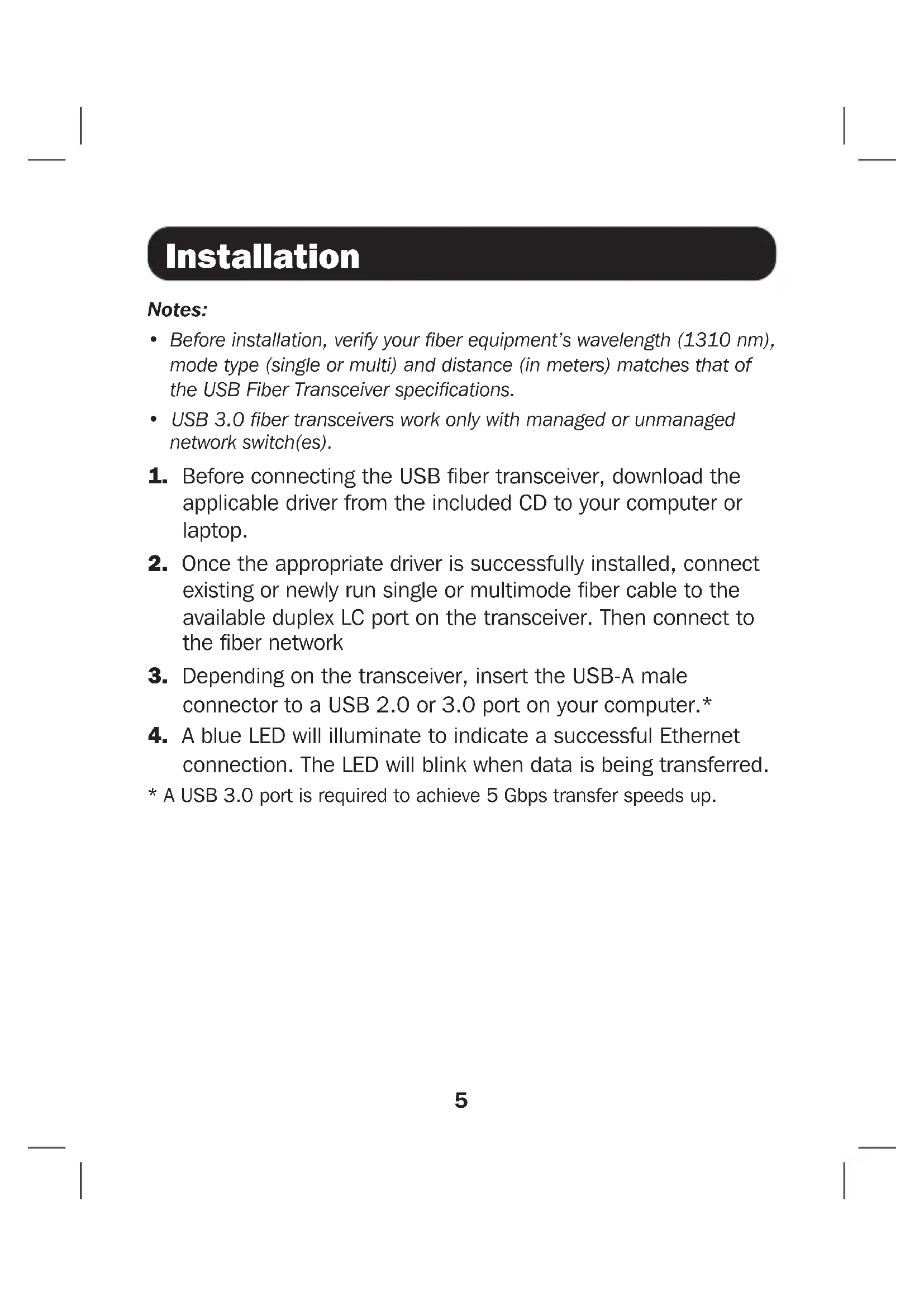 - USB 3.0 fiber transceivers work only with managed or unmanaged network switch(es).