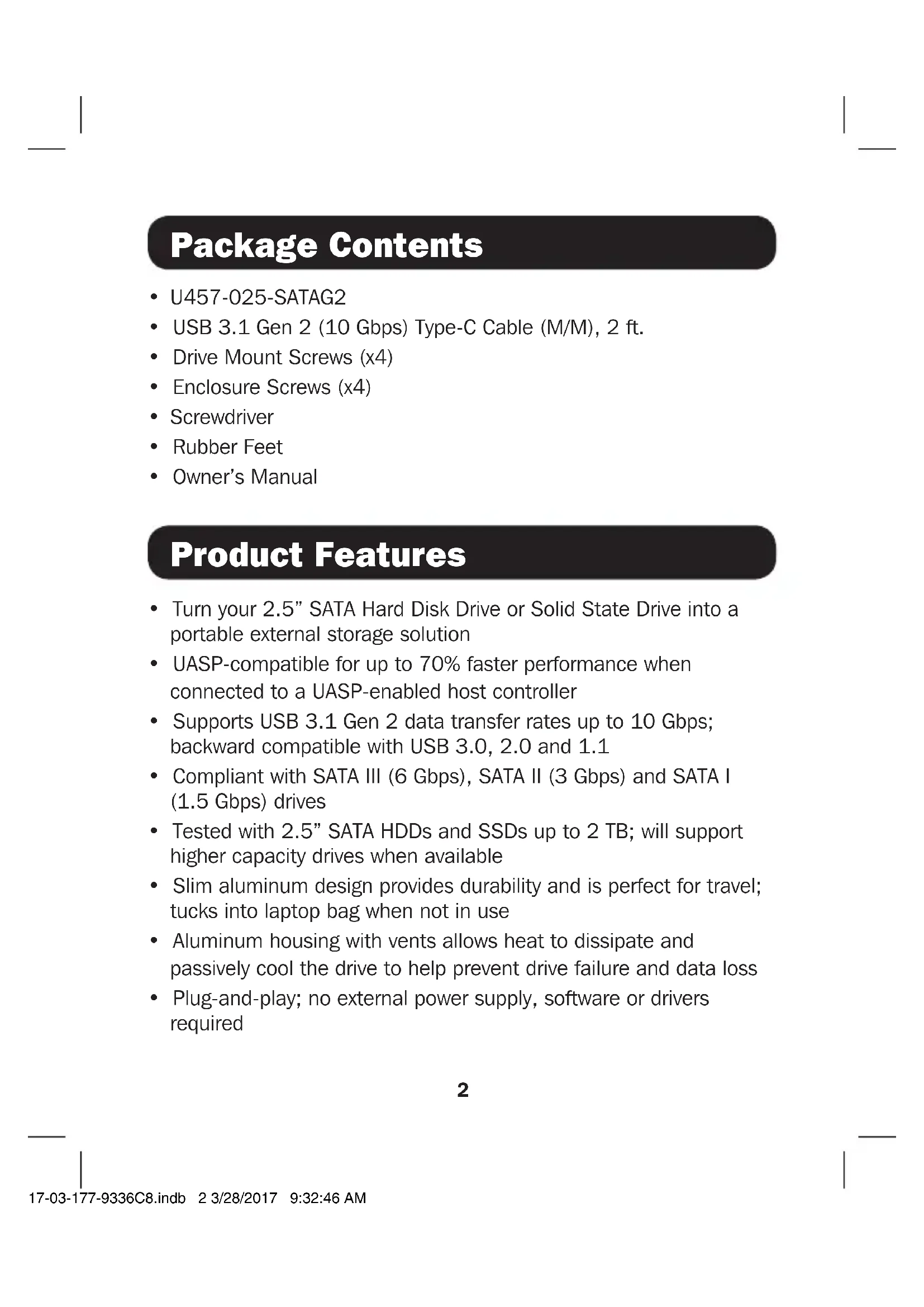 - Send the new equipment back for recycling when this ultimately becomes waste Use of this equipment in life support applications where failure of this equipment can reasonably be expected to cause the failure of the life support equipment or to significantly affect its safety or effectiveness is not recommended. Tripp Lite has a policy of continuous improvement. Specifications are subject to change without notice. 1111 W. 35th Street, Chicago, IL 60609 USA www.tripplite.com/support 17-03-177-9336C8.indb 7 3/28/2017 9:32:48 AM8 Manual del Propietario Caja para SSD / HDD SATA de 2.5” USB 3.1 Gen 2 (10 Gbps) USB Type-C Modelo: U457-025-SATAG2 English 1 • Français 15 • Русский 22 1111 W. 35th Street, Chicago, IL 60609 EE UU www.tripplite.com/support Copyright © 2017 Tripp Lite. Todos los derechos reservados. 17-03-177-9336C8.indb 8 3/28/2017 9:32:48 AM9 Contenido del Empaque Características del Producto