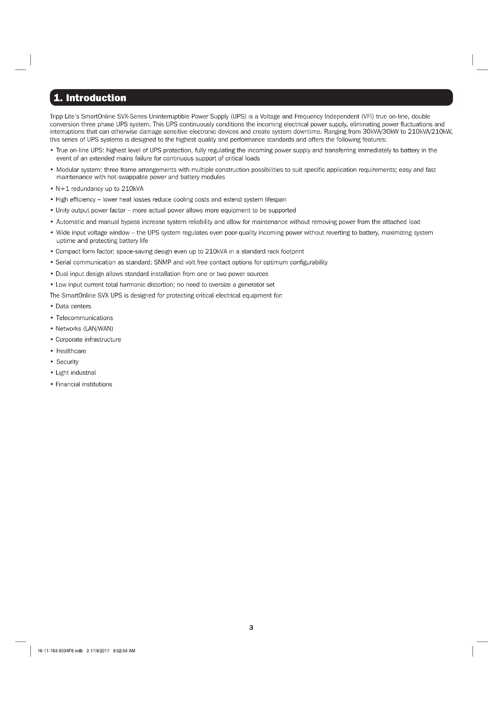 SAVE THESE INSTRUCTIONS. This manual contains important instructions and warnings that should be followed during the installation, operation and maintenance of all Tripp Lite SmartOnline SVX 3-phase UPS systems and batteries. Read all instructions thoroughly before attempting to move, install or operate the UPS. Failure to comply may invalidate the warranty and cause property damage and/or personal injury.