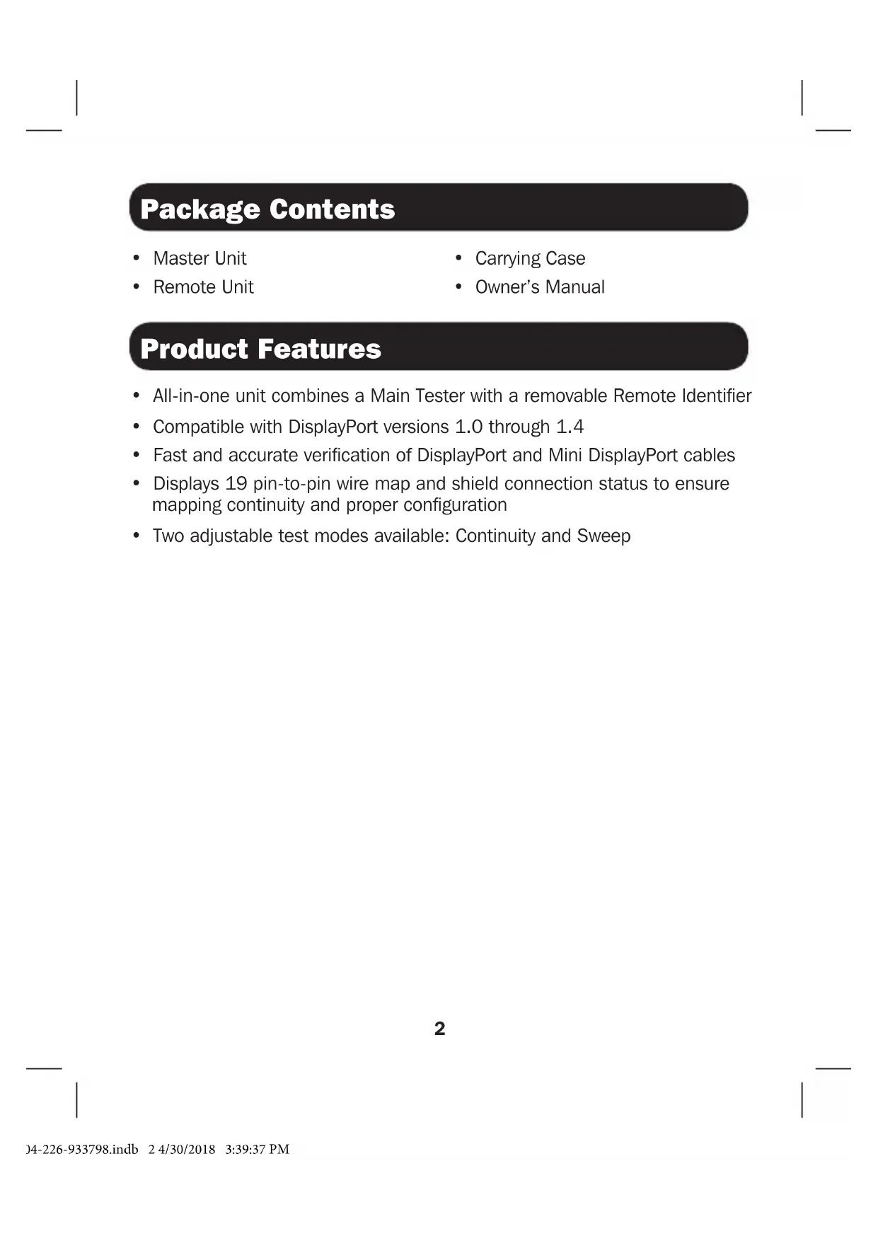 - Two adjustable test modes available: Continuity and Sweep 18-04-226-933798.indb 2 4/30/2018 3:39:37 PM3 Operation Notes: