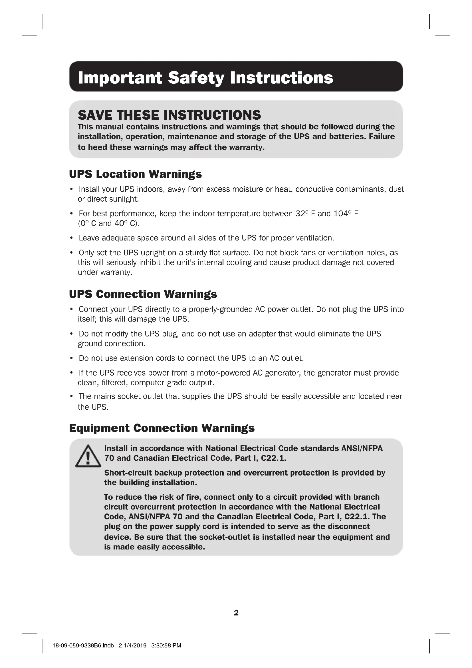 - The mains socket outlet that supplies the UPS should be easily accessible and located near the UPS. Equipment Connection Warnings Install in accordance with National Electrical Code standards ANSI/NFPA 70 and Canadian Electrical Code, Part I, C22.1. Short-circuit backup protection and overcurrent protection is provided by the building installation. To reduce the risk of fire, connect only to a circuit provided with branch circuit overcurrent protection in accordance with the National Electrical Code, ANSI/NFPA 70 and the Canadian Electrical Code, Part I, C22.1. The plug on the power supply cord is intended to serve as the disconnect device. Be sure that the socket-outlet is installed near the equipment and is made easily accessible. Important Safety Instructions 18-09-059-9338B6.indb 2 1/4/2019 3:30:58 PM3 Important Safety Instructions