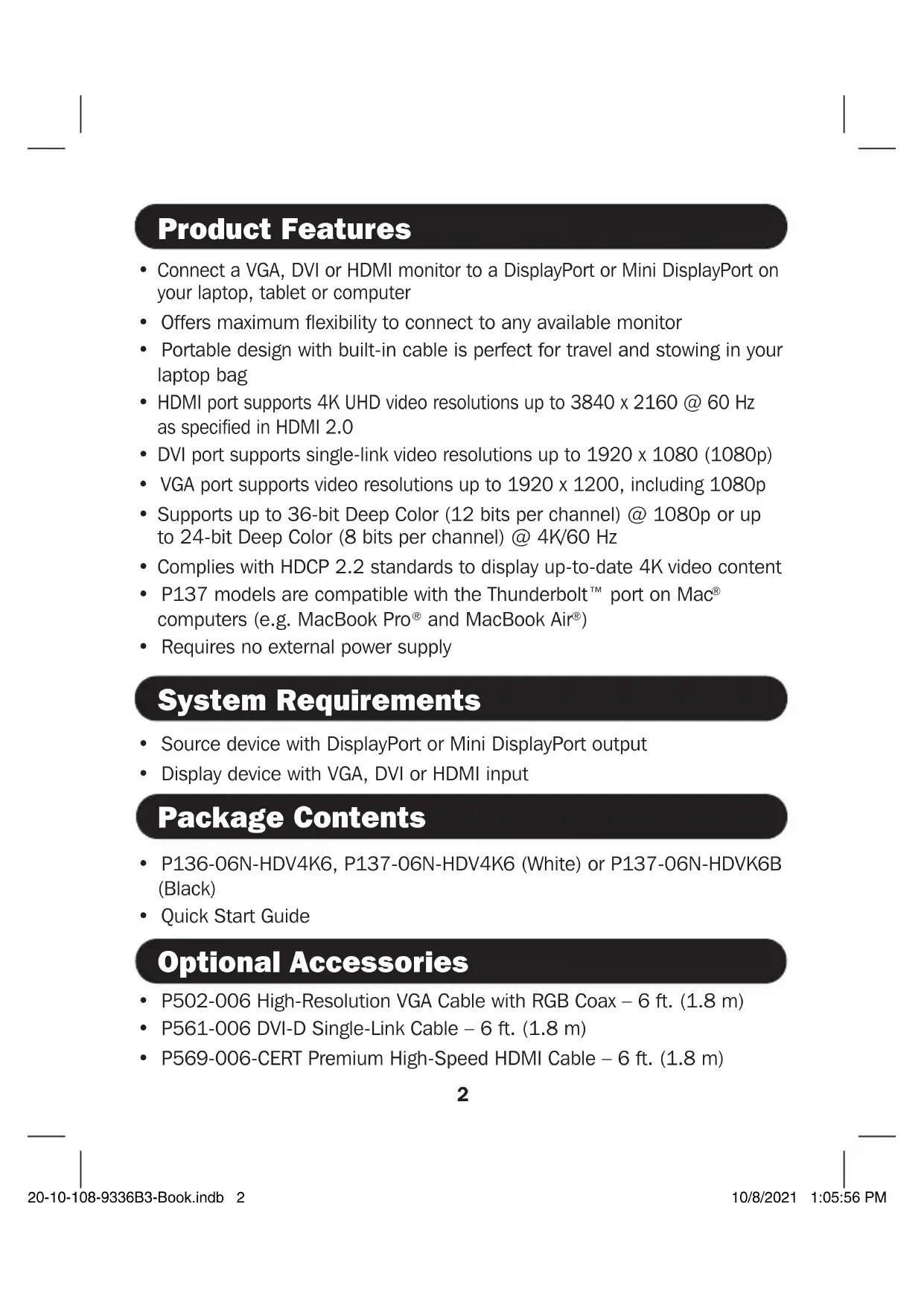 20-10-108-9336B3-Book.indb 320-10-108-9336B3-Book.indb 3 10/8/2021 1:05:56 PM10/8/2021 1:05:56 PM4 Warranty and Product Registration 3-Year Limited Warranty TRIPP LITE warrants its products to be free from defects in materials and workmanship for a period of three (3) years from the date of initial purchase. TRIPP LITE’s obligation under this warranty is limited to repairing or replacing (at its sole option) any such defective products. To obtain service under this warranty, you must obtain a Returned Material Authorization (RMA) number from TRIPP LITE or an authorized TRIPP LITE service center. Products must be returned to TRIPP LITE or an authorized TRIPP LITE service center with transportation charges prepaid and must be accompanied by a brief description of the problem encountered and proof of date and place of purchase. This warranty does not apply to equipment, which has been damaged by accident, negligence or misapplication or has been altered or modified in any way.EXCEPT AS PROVIDED HEREIN, TRIPP LITE MAKES NO WARRANTIES, EXPRESS OR IMPLIED, INCLUDING WARRANTIES OF MERCHANTABILITY AND FITNESS FOR A PARTICULAR PURPOSE. Some states do not permit limitation or exclusion of implied warranties; therefore, the aforesaid limitation(s) or exclusion(s) may not apply to the purchaser.EXCEPT AS PROVIDED ABOVE, IN NO EVENT WILL TRIPP LITE BE LIABLE FOR DIRECT, INDIRECT, SPECIAL, INCIDENTAL OR CONSEQUENTIAL DAMAGES ARISING OUT OF THE USE OF THIS PRODUCT, EVEN IF ADVISED OF THE POSSIBILITY OF SUCH DAMAGE. Specifically, TRIPP LITE is not liable for any costs, such as lost profits or revenue, loss of equipment, loss of use of equipment, loss of software, loss of data, costs of substitutes, claims by third parties, or otherwise.Product Registration Visit www.tripplite.com/warranty today to register your new Tripp Lite product. You’ll be automatically entered into a drawing for a chance to win a FREE Tripp Lite product!** No purchase necessary. Void where prohibited. Some restrictions apply. See website for details.FCC Notice, Class B This device complies with part 15 of the FCC Rules. Operation is subject to the following two conditions: (1) This device may not cause harmful interference, and (2) this device must accept any interference received, including interference that may cause undesired operation.Note: This equipment has been tested and found to comply with the limits for a Class B digital device, pursuant to part 15 of the FCC Rules. These limits are designed to provide reasonable protection against harmful interference in a residential installation. This equipment generates, uses and can radiate radio frequency energy and, if not installed and used in accordance with the instructions, may cause harmful interference to radio communications. However, there is no guarantee that interference will not occur in a particular installation. If this equipment does cause harmful interference to radio or television reception, which can be determined by turning the equipment off and on, the user is encouraged to try to correct the interference by one or more of the following measures:• Reorient or relocate the receiving antenna.• Increase the separation between the equipment and receiver.• Connect the equipment into an outlet on a circuit different from that to which the receiver is connected.• Consult the dealer or an experienced radio/TV technician for help.Any changes or modifications to this equipment not expressly approved by Tripp Lite could void the user’s authority to operate this equipment.WEEE Compliance Information for Tripp Lite Customers and Recyclers (European Union) Under the Waste Electrical and Electronic Equipment (WEEE) Directive and implementing regulations, when customers buy new electrical and electronic equipment from Tripp Lite they are entitled to:• Send old equipment for recycling on a one-for-one, like-for-like basis (this varies depending on the country)• Send the new equipment back for recycling when this ultimately becomes wasteWARNING Use of this equipment in life support applications where failure of this equipment can reasonably be expected to cause the failure of the life support equipment or to significantly affect its safety or effectiveness is not recommended. Tripp Lite has a policy of continuous improvement. Specifications are subject to change without notice. Photos and illustrations may differ slightly from actual products.20-10-108 93-36B3_RevC 1111 W. 35th Street, Chicago, IL 60609 USA tripplite.com/support 20-10-108-9336B3-Book.indb 420-10-108-9336B3-Book.indb 4 10/8/2021 1:05:56 PM10/8/2021 1:05:56 PM5MÁS DE AÑOS Guía de Inicio Rápido Convertidor Todo en Uno DisplayPort 1.2 a VGA / DVI / HDMI Modelo: P136-06N-HDV4K6 Convertidor Todo en Uno Mini DisplayPort 1.2 a VGA / DVI / HDMI Modelos: P137-06N-HDV4K6 (Blanco), P137-06N-HDVK6B (Negro) 1111 W. 35th Street, Chicago, IL 60609, EE. UU. tripplite.com/support Copyright © 2021 Tripp Lite. Todos los derechos reservados. English 1 • Français 9 • Русский 13• Deutsch 17 20-10-108-9336B3-Book.indb 520-10-108-9336B3-Book.indb 5 10/8/2021 1:05:56 PM10/8/2021 1:05:56 PM6 Características del Producto Requisitos del Sistema