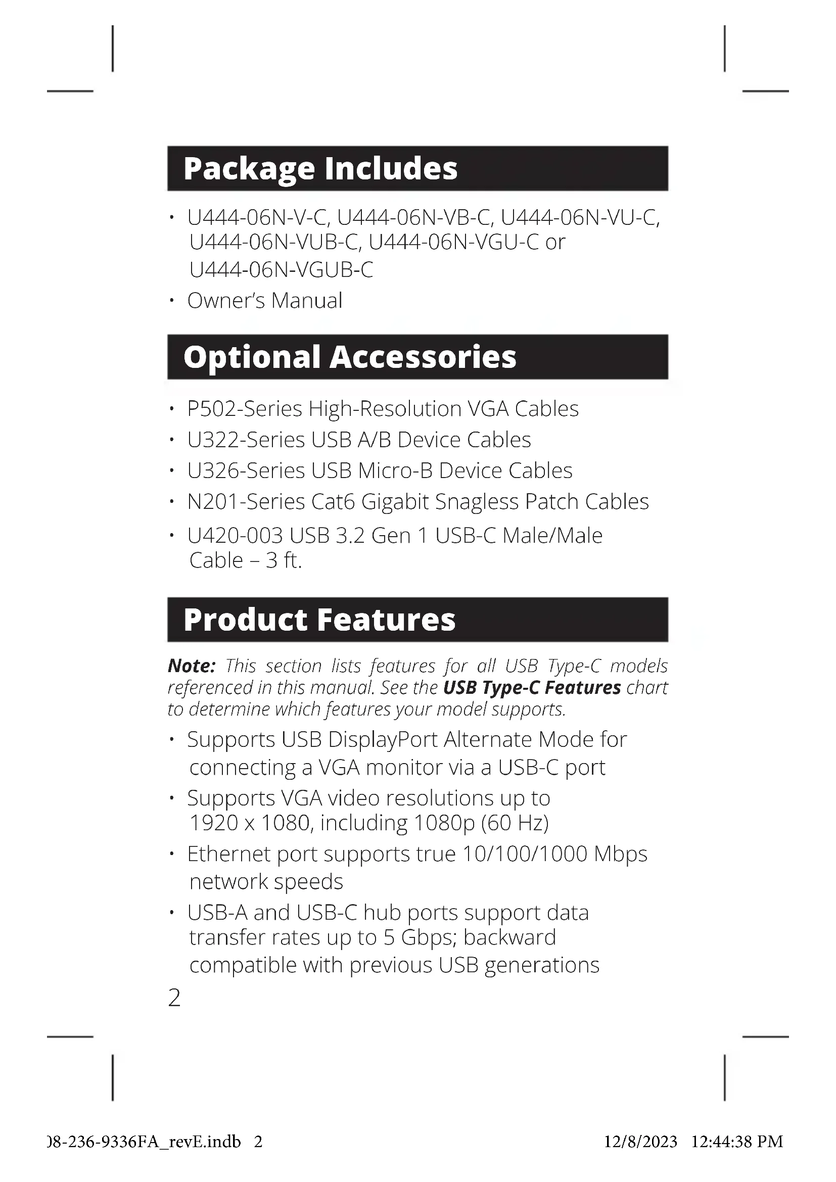 using a UTP cable (such as N201-Series Cat6 cables).** *USB-C port for U444-06N-VU-C and U444-06N-VUB-C models support both data transfer and charging. **See the USB Type-C Features chart for the features your product supports. 23-08-236-9336FA_revE.indb 423-08-236-9336FA_revE.indb 4 12/8/2023 12:44:38 PM12/8/2023 12:44:38 PM5 Models U444-06N-V-C / U444-06N-VB-C U444-06N-VU-C /