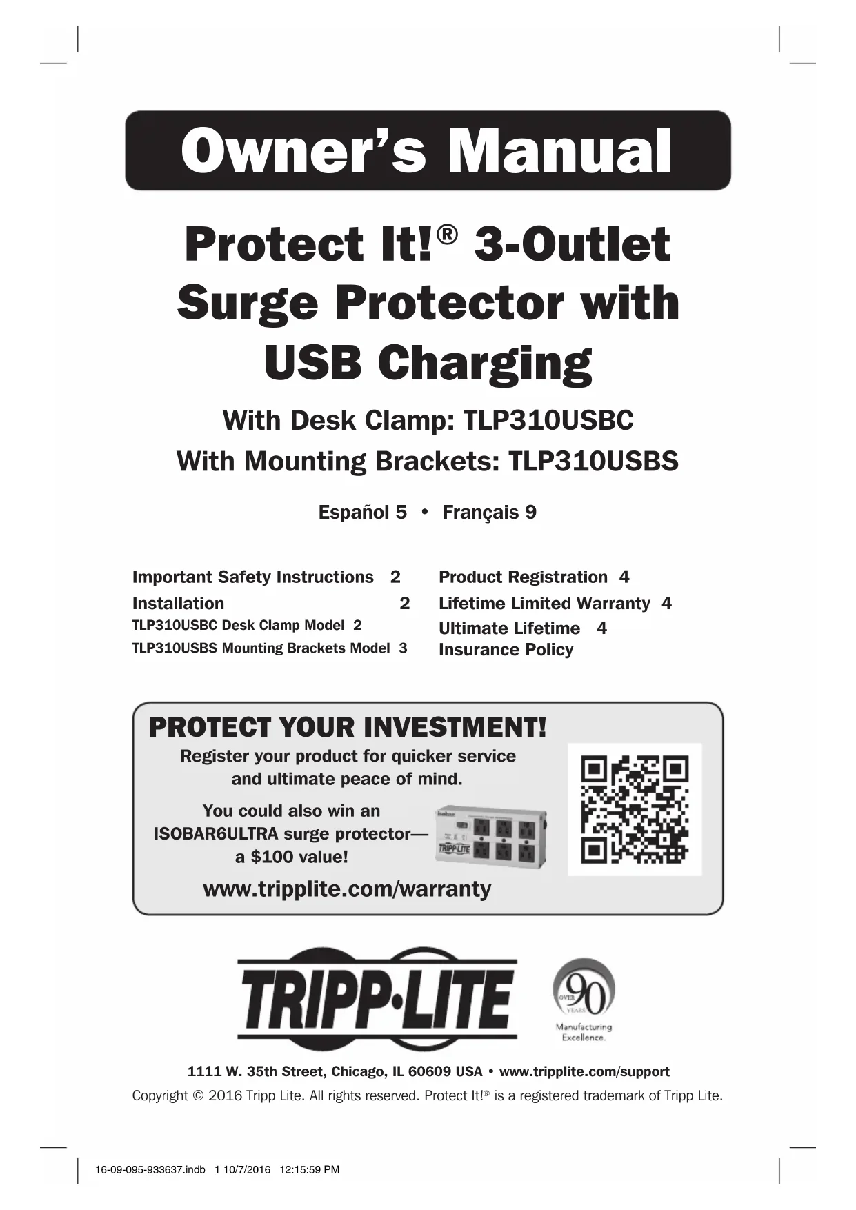 3-Outlet Surge Protector with USB Charging With Desk Clamp: TLP310USBC With Mounting Brackets: TLP310USBS Español 5 • Français 9 PROTECT YOUR INVESTMENT! Register your product for quicker service and ultimate peace of mind. You could also win an ISOBAR6ULTRA surge protector— a $100 value! www.tripplite.com/warranty 1111 W. 35th Street, Chicago, IL 60609 USA • www.tripplite.com/supportCopyright © 2016 Tripp Lite. All rights reserved. Protect It! is a registered trademark of Tripp Lite.Important Safety Instructions 2Installation 2TLP310USBC Desk Clamp Model 2TLP310USBS Mounting Brackets Model 3Product Registration 4Lifetime Limited Warranty 4Ultimate Lifetime 4 Insurance Policy16-09-095-933637.indb 1 10/7/2016 12:15:59 PM2 Important Safety Instructions Installation –TLP310USBC Desk Clamp Model